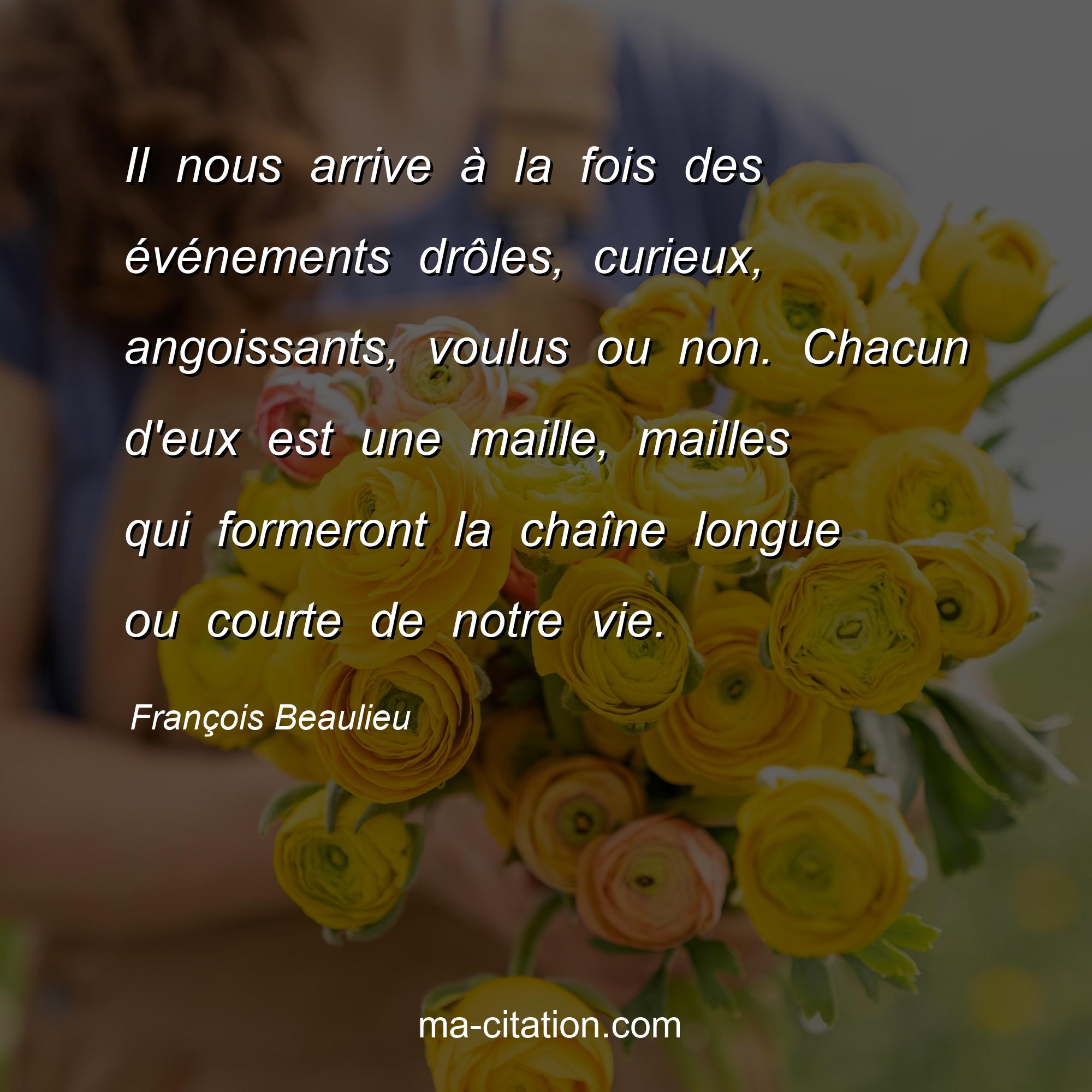 François Beaulieu est l'auteur de la citation sur la vie "Il nous arrive à la fois des événements drôles, curieux, angoissants, voulus ou non. Chacun d'eux est une maille, mailles qui formeront la chaîne longue ou courte de notre vie.".