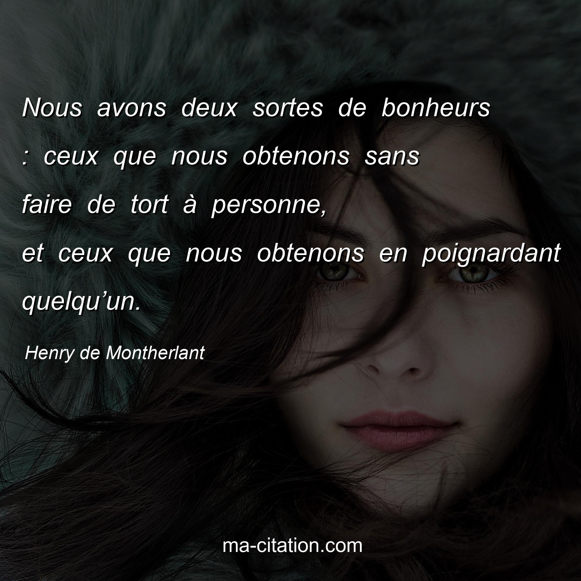 Citation sur la vie de Henry de Montherlant :Nous avons deux sortes de bonheurs : ceux que nous obtenons sans faire de tort à personne, et ceux que nous obtenons en poignardant quelqu’un.