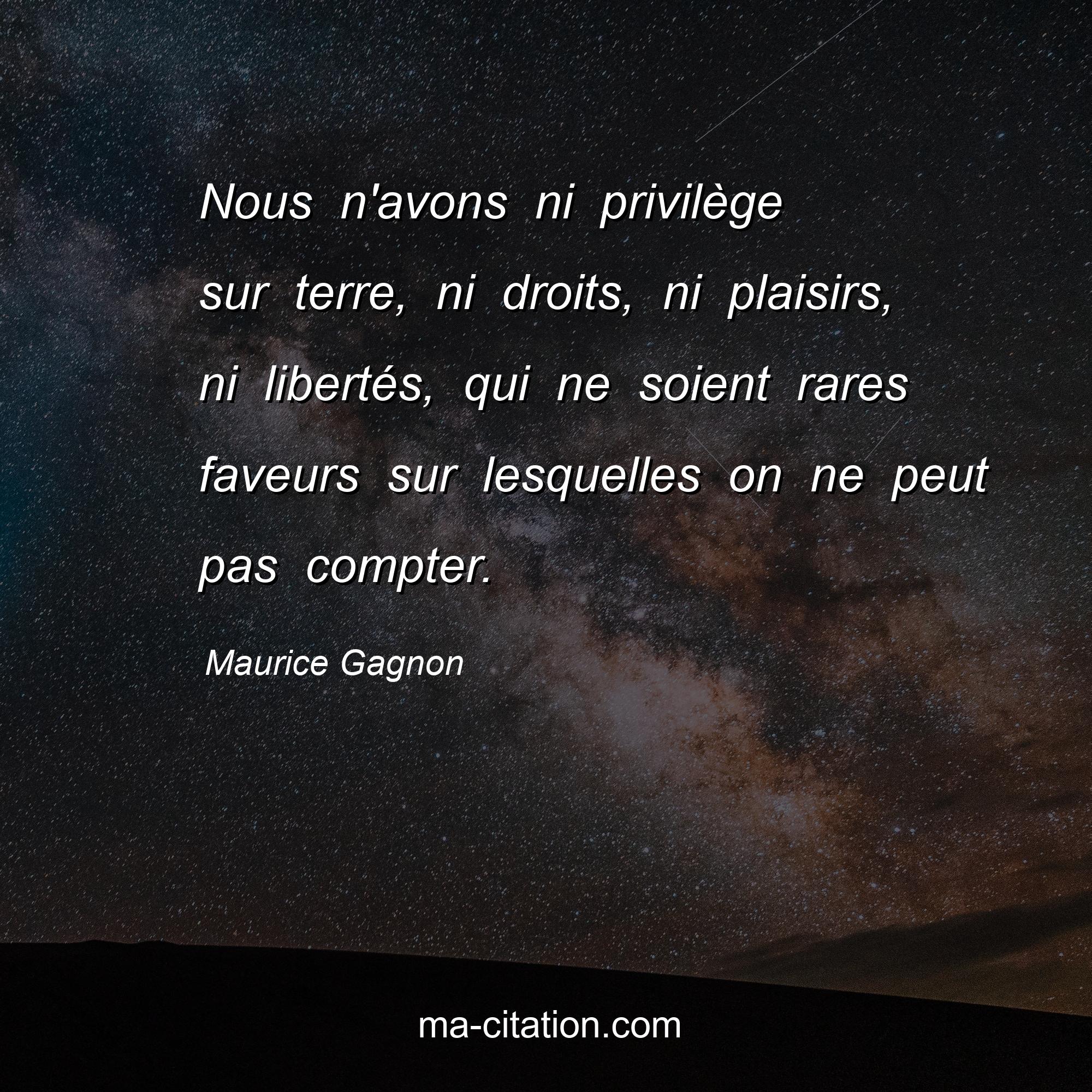 Maurice Gagnon est l'auteur de la citation sur la vie "Nous n'avons ni privilège sur terre, ni droits, ni plaisirs, ni libertés, qui ne soient rares faveurs sur lesquelles on ne peut pas compter.".