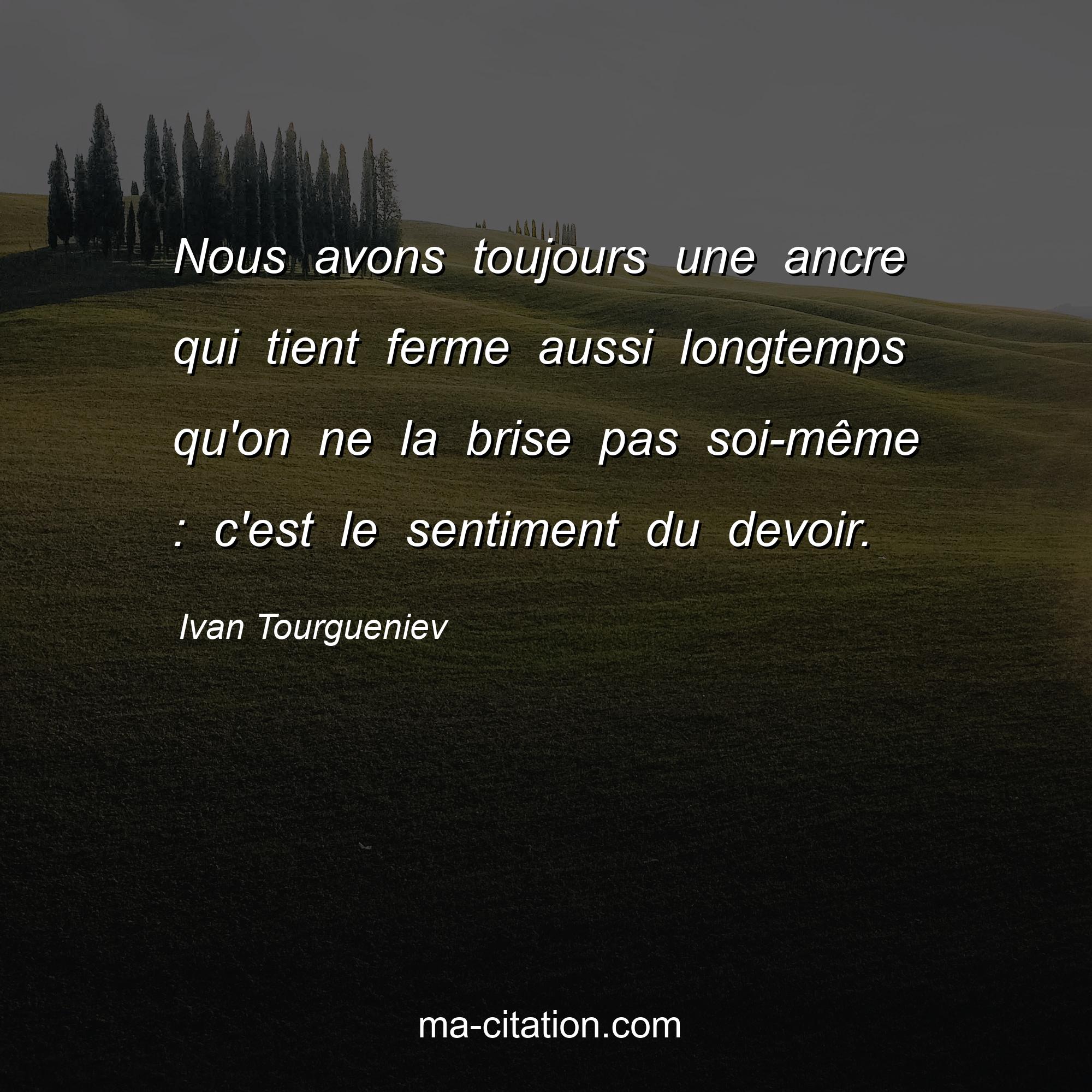 Citation sur la vie d'Ivan Tourgueniev :Nous avons toujours une ancre qui tient ferme aussi longtemps qu'on ne la brise pas soi-même : c'est le sentiment du devoir.