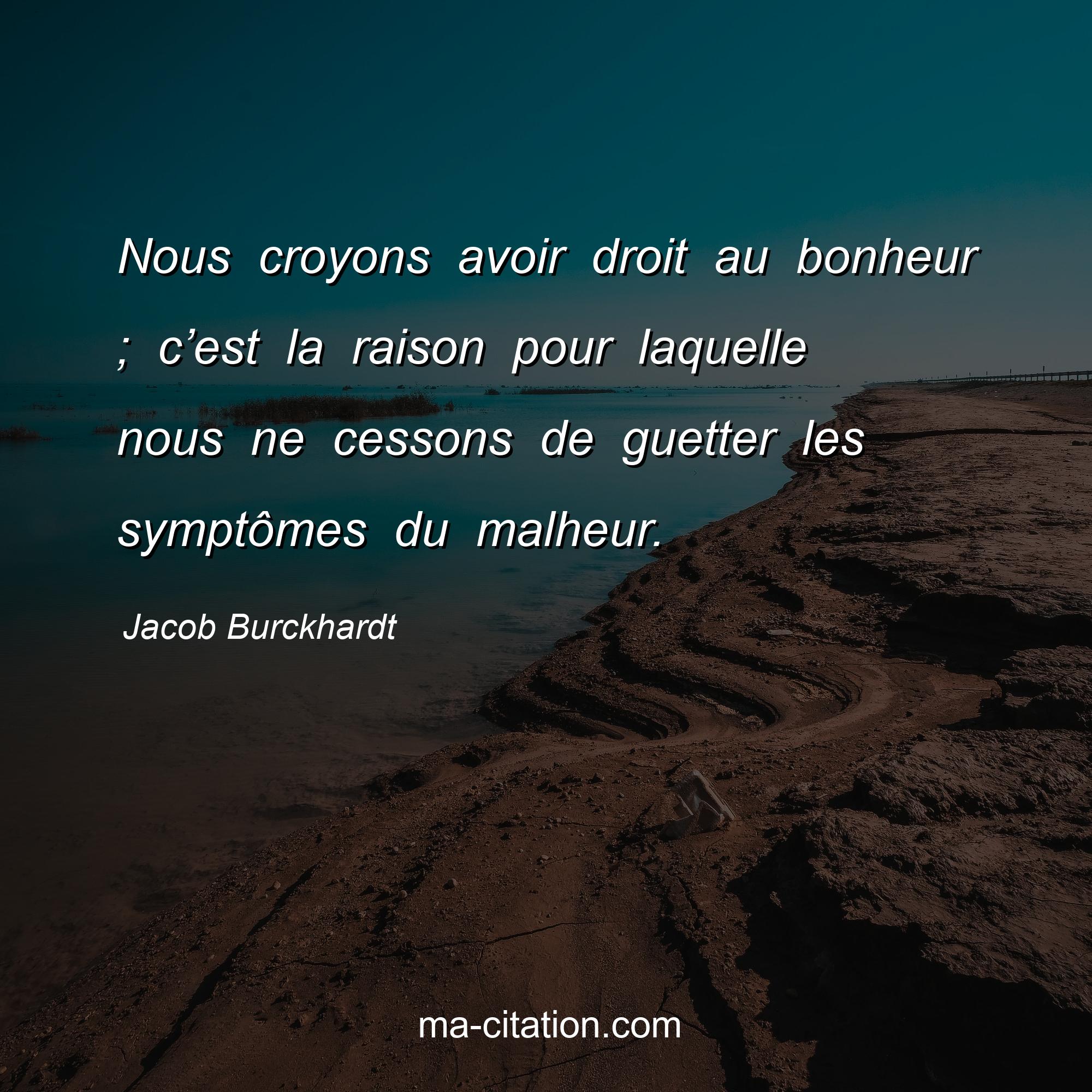 Citation sur la vie de Jacob Burckhardt :Nous croyons avoir droit au bonheur ; c’est la raison pour laquelle nous ne cessons de guetter les symptômes du malheur.