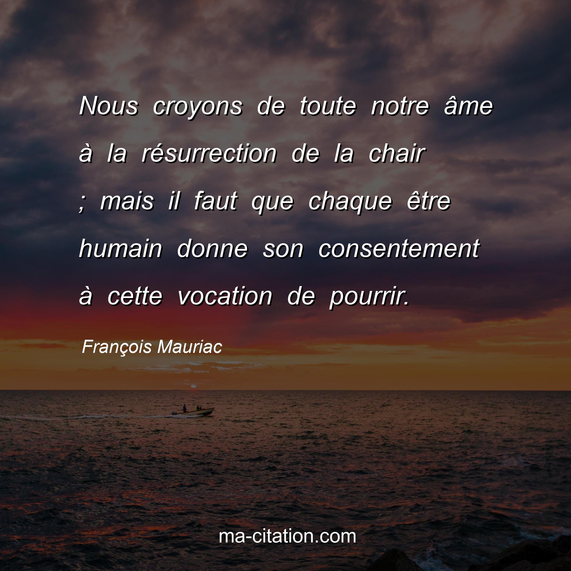 Citation sur la vie de François Mauriac :Nous croyons de toute notre âme à la résurrection de la chair ; mais il faut que chaque être humain donne son consentement à cette vocation de pourrir.