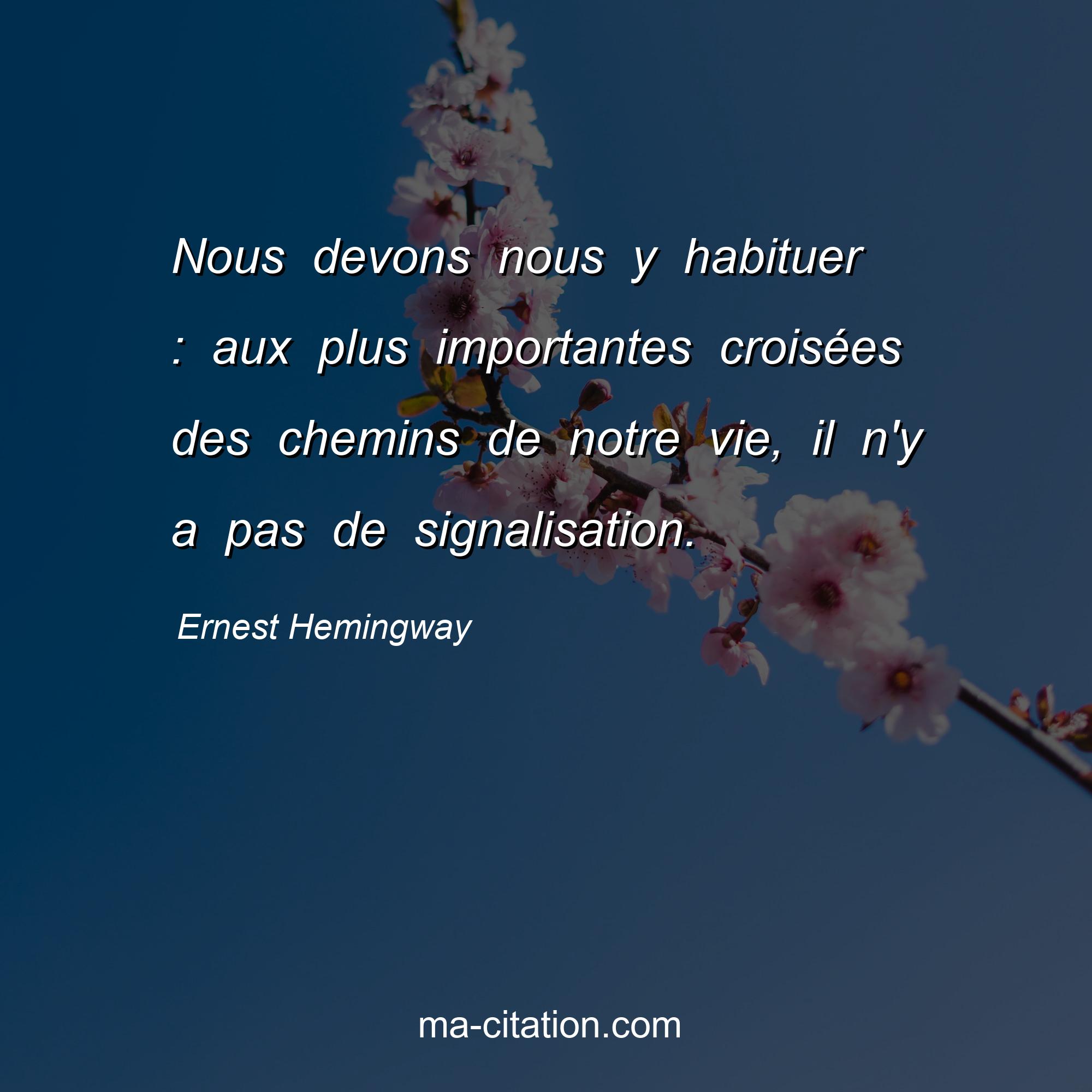 Citation sur la vie d'Ernest Hemingway :Nous devons nous y habituer : aux plus importantes croisées des chemins de notre vie, il n'y a pas de signalisation.