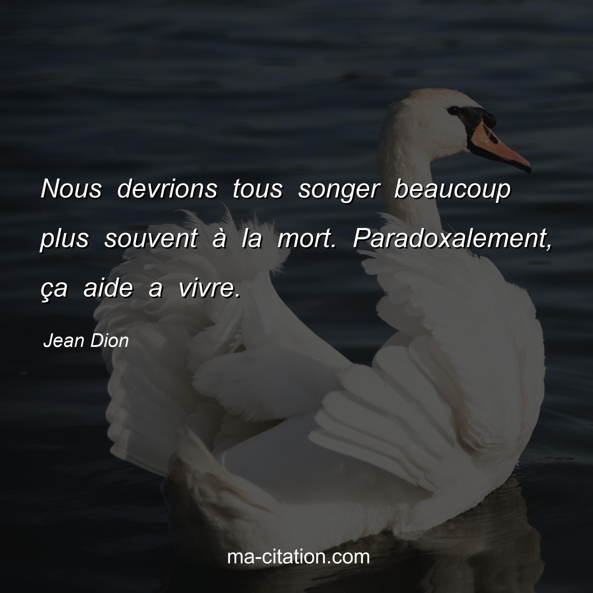 Jean Dion est l'auteur de la citation sur la vie "Nous devrions tous songer beaucoup plus souvent à la mort. Paradoxalement, ça aide a vivre.".