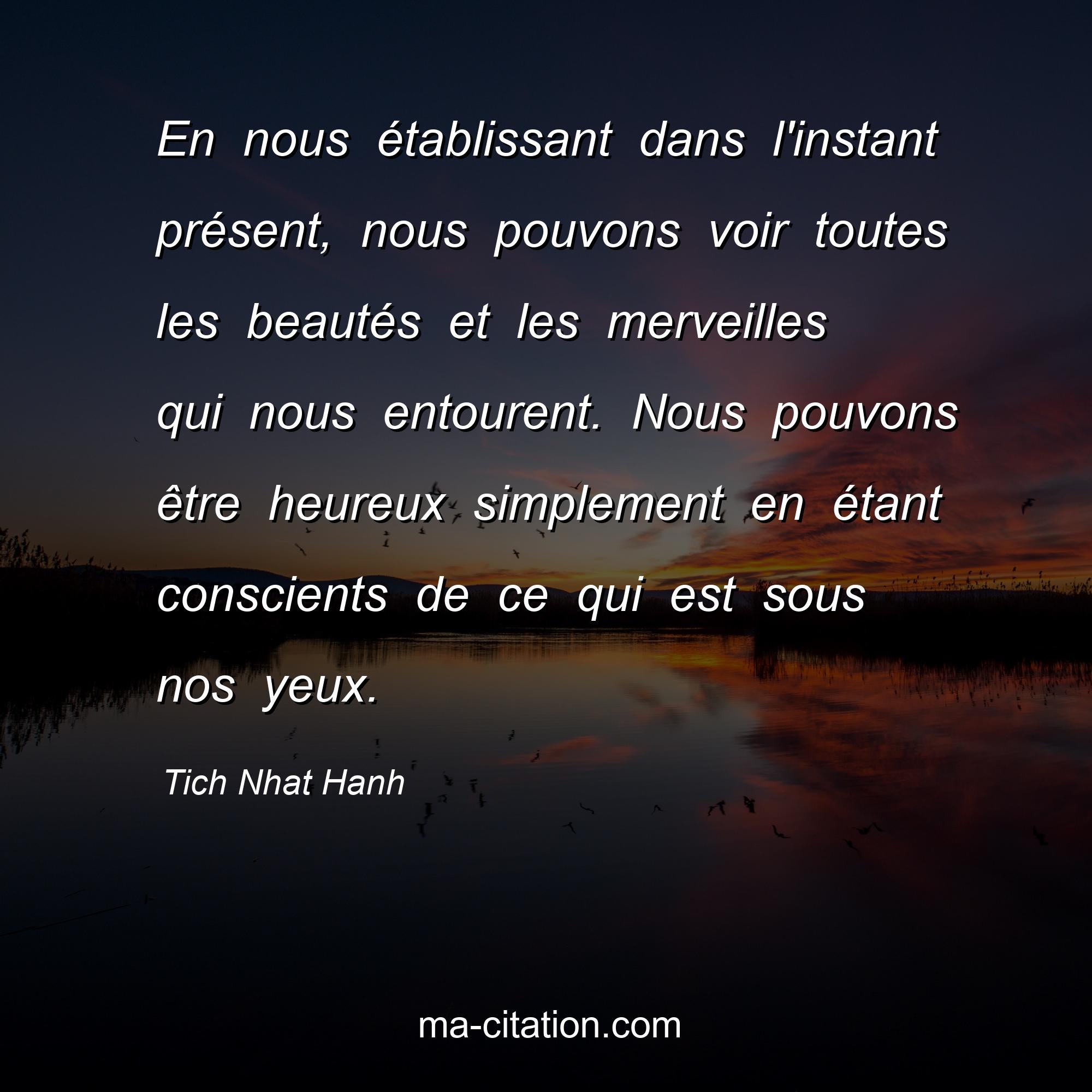 Citation sur la vie de Tich Nhat Hanh :En nous établissant dans l'instant présent, nous pouvons voir toutes les beautés et les merveilles qui nous entourent. Nous pouvons être heureux simplement en étant conscients de ce qui est sous nos yeux.