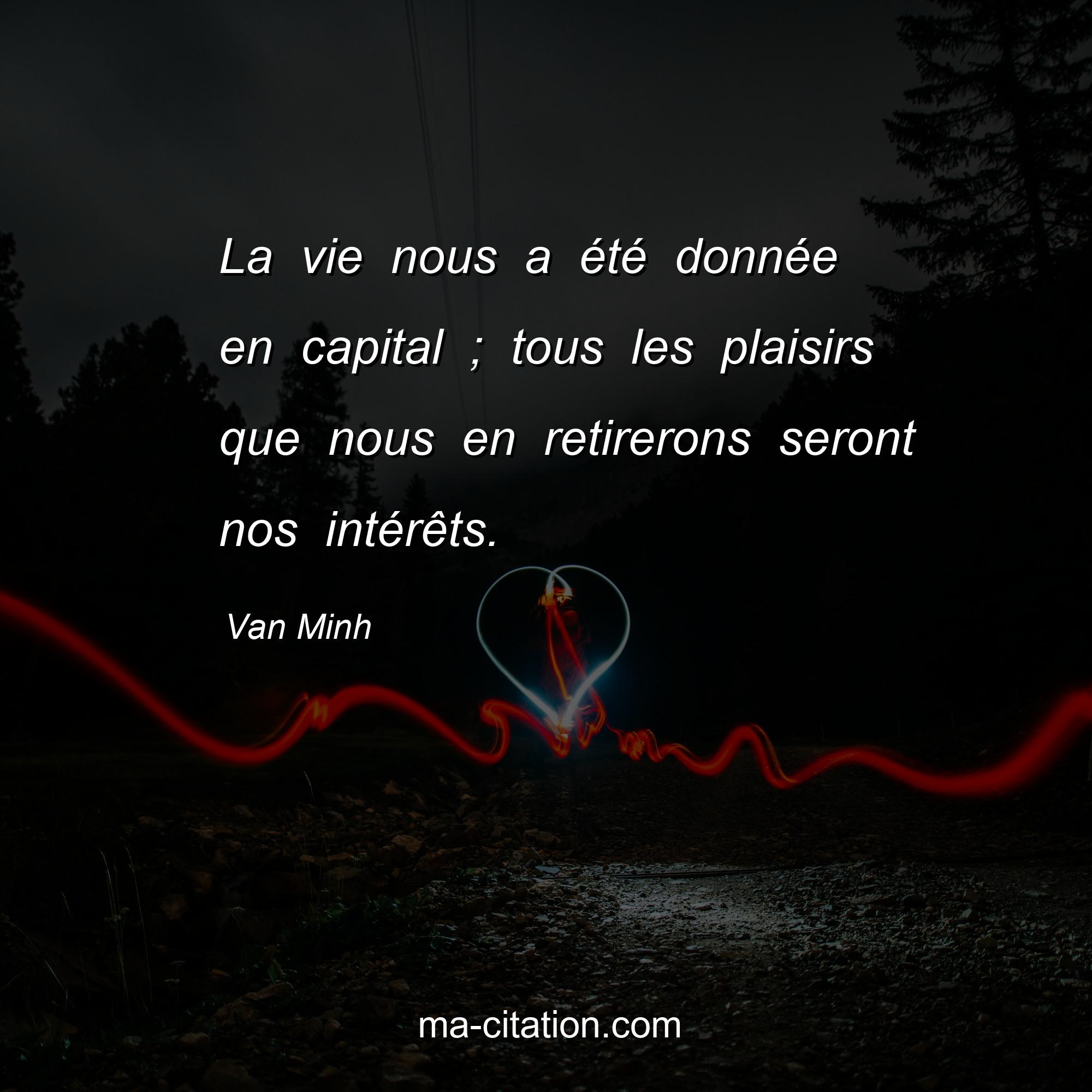 Van Minh est l'auteur de la citation sur la vie "La vie nous a été donnée en capital ; tous les plaisirs que nous en retirerons seront nos intérêts.".