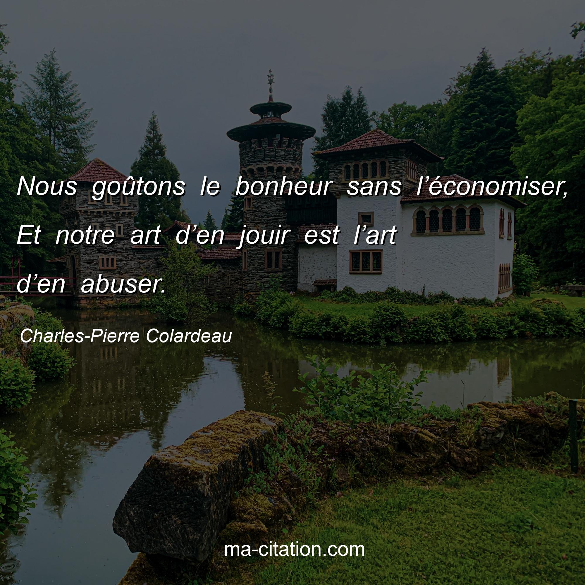 Citation sur la vie de Charles-Pierre Colardeau :Nous goûtons le bonheur sans l’économiser, Et notre art d’en jouir est l’art d’en abuser.