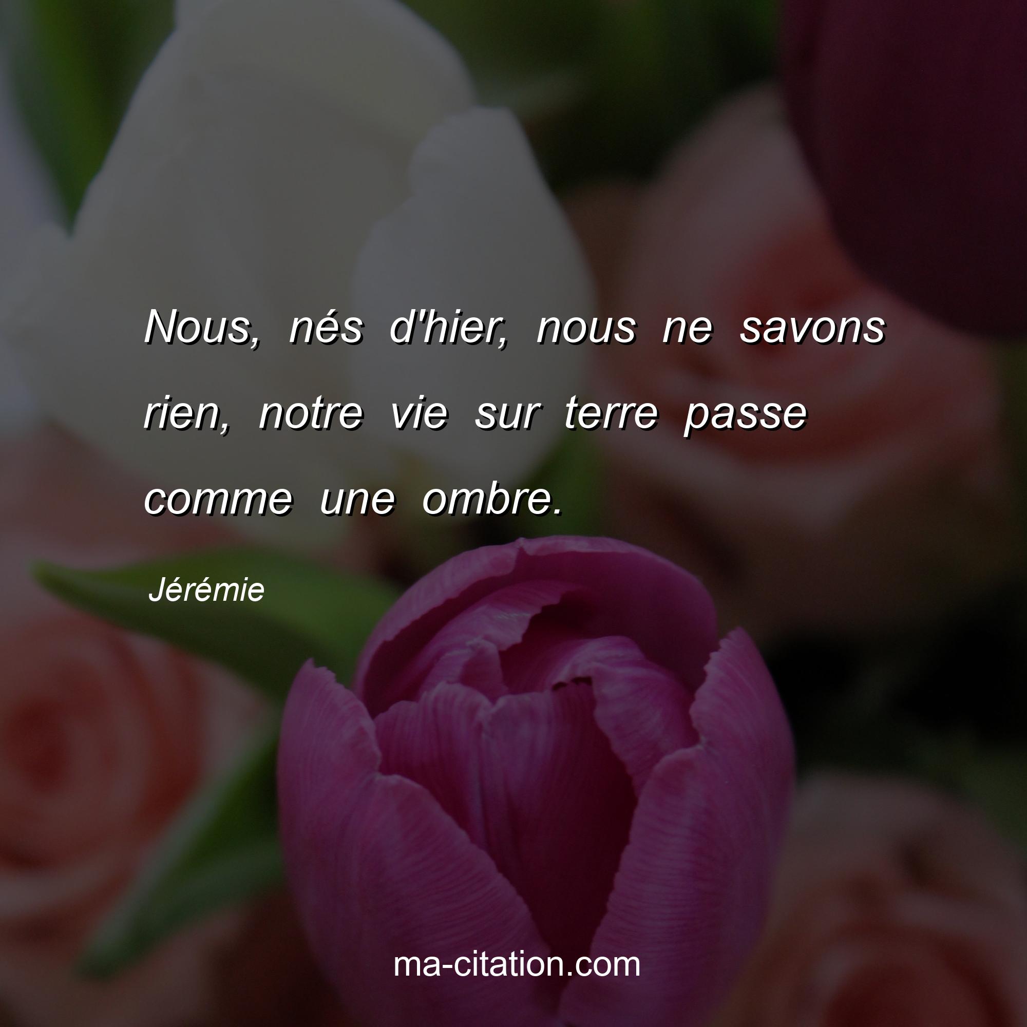 Citation sur la vie de Jérémie :Nous, nés d'hier, nous ne savons rien, notre vie sur terre passe comme une ombre.