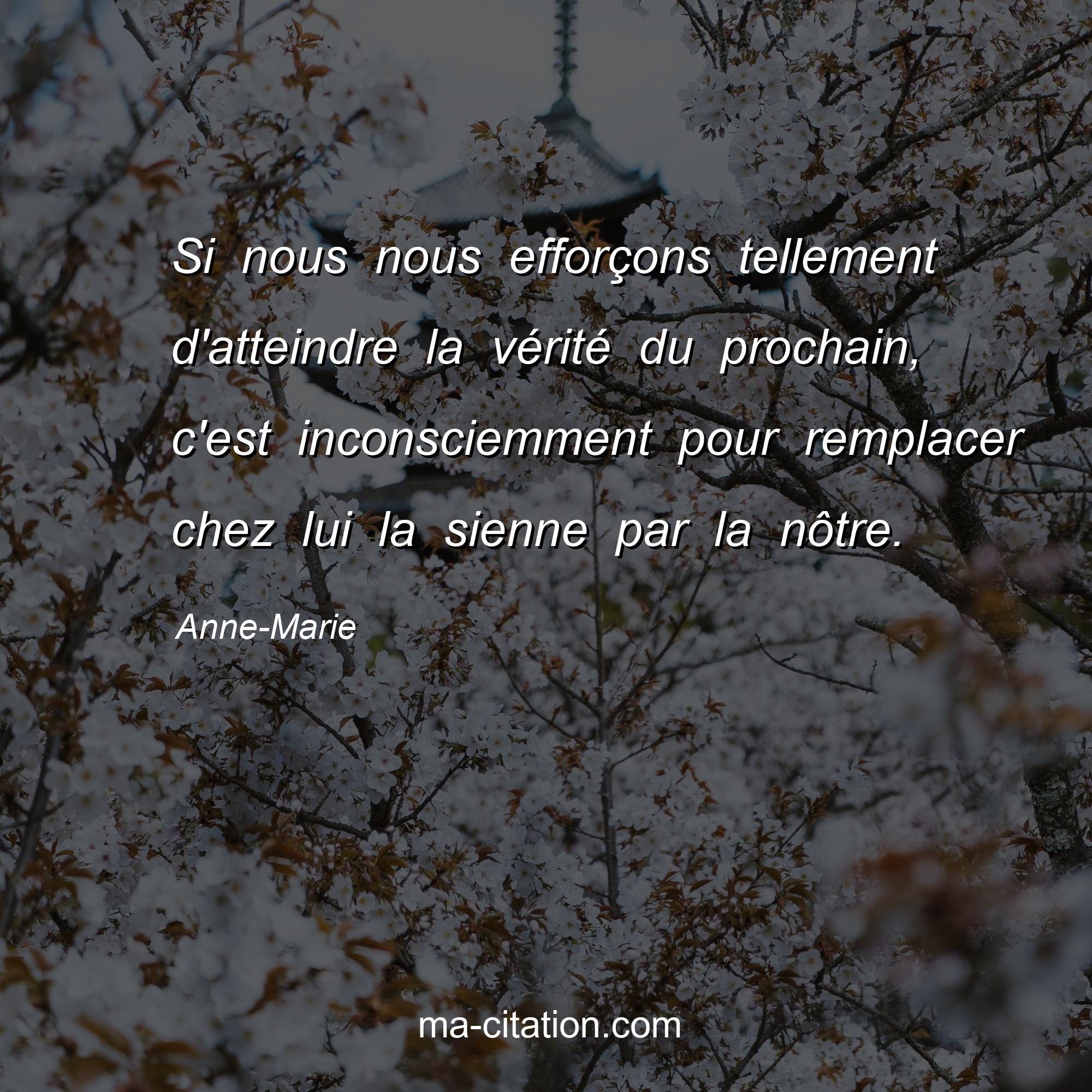 Anne-Marie est l'auteur de la citation sur la vie "Si nous nous efforçons tellement d'atteindre la vérité du prochain, c'est inconsciemment pour remplacer chez lui la sienne par la nôtre.".