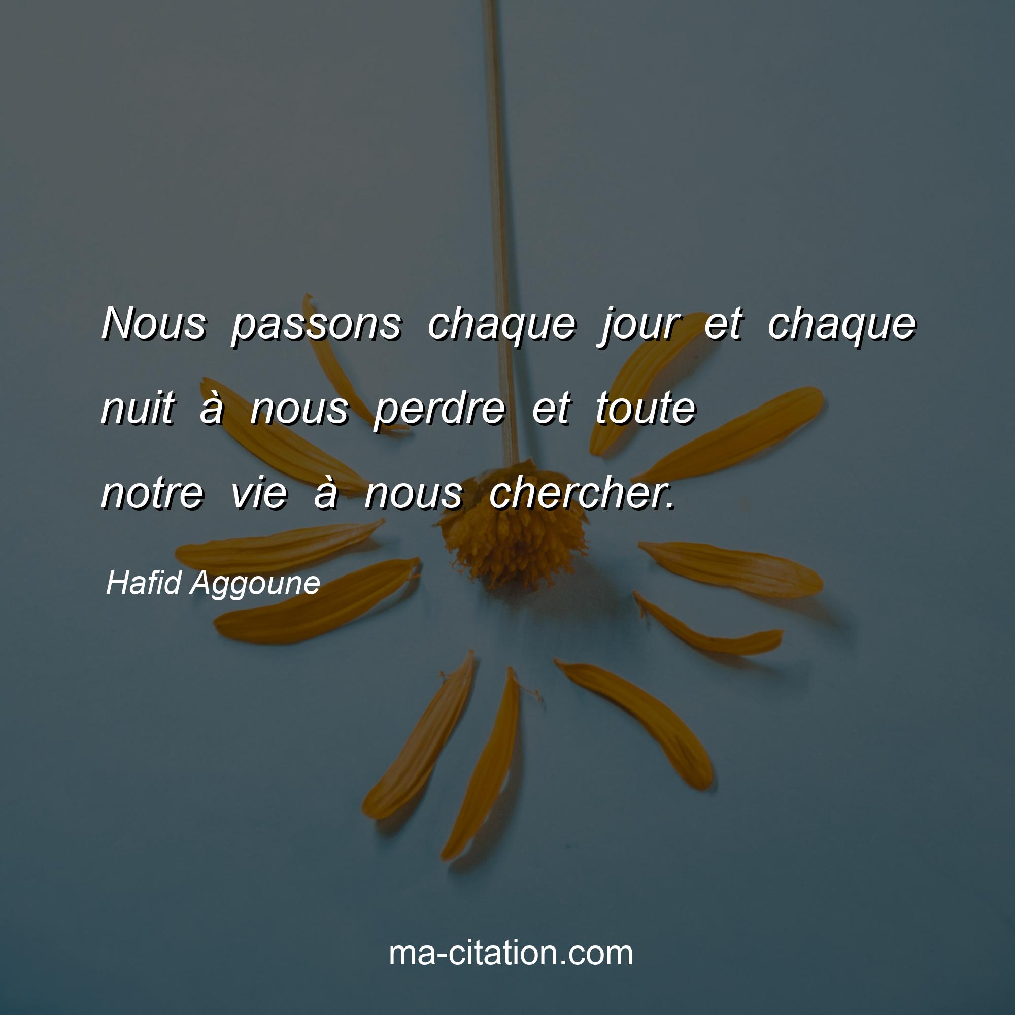 Hafid Aggoune est l'auteur de la citation sur la vie "Nous passons chaque jour et chaque nuit à nous perdre et toute notre vie à nous chercher.".