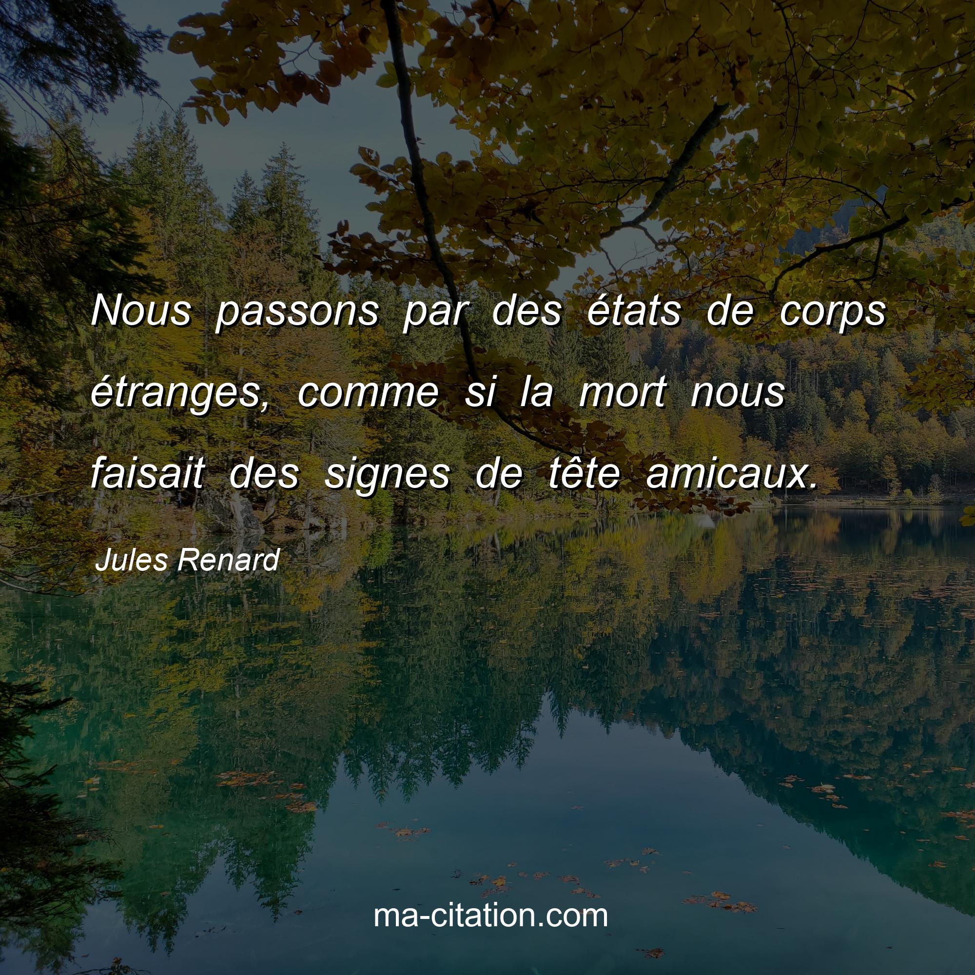 Citation sur la vie de Jules Renard :Nous passons par des états de corps étranges, comme si la mort nous faisait des signes de tête amicaux.