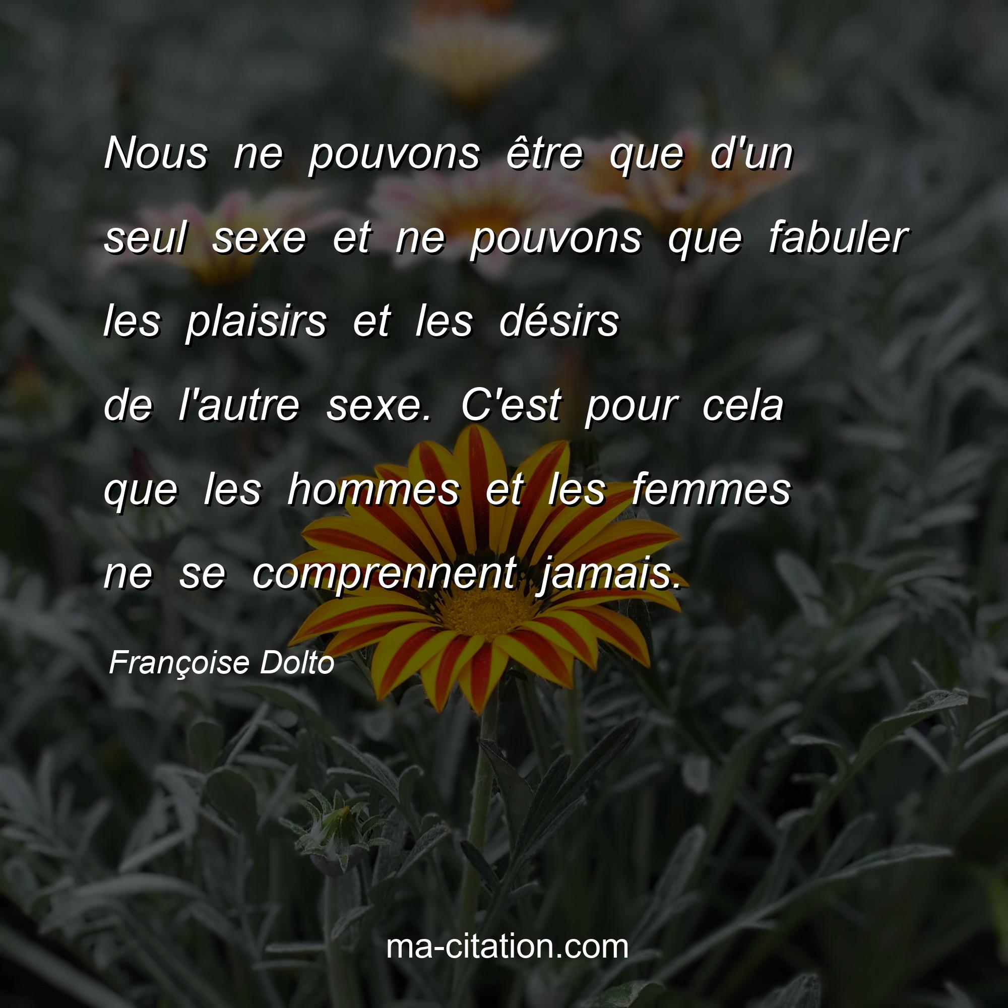 Citation sur la vie de Françoise Dolto :Nous ne pouvons être que d'un seul sexe et ne pouvons que fabuler les plaisirs et les désirs de l'autre sexe. C'est pour cela que les hommes et les femmes ne se comprennent jamais.