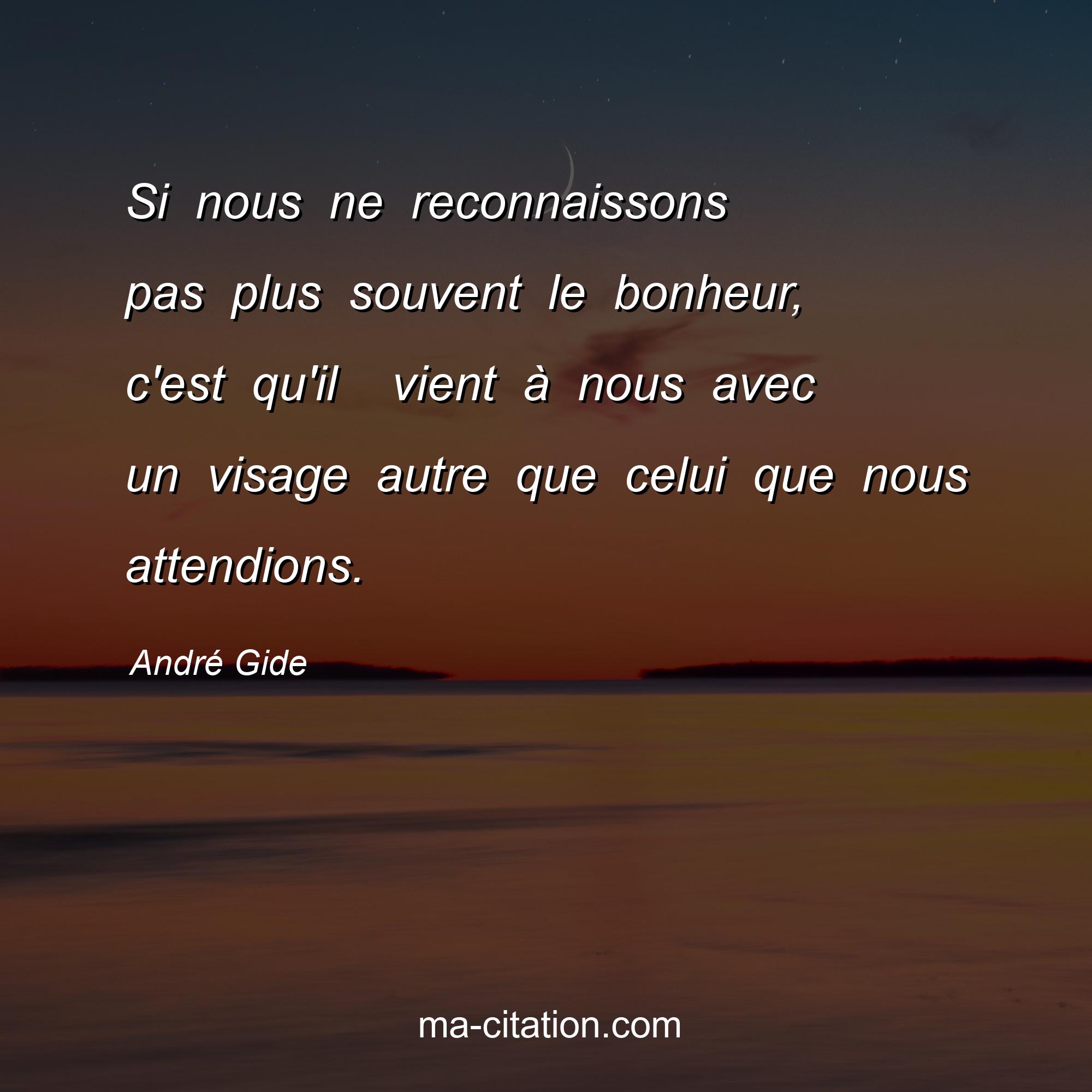 Citation sur la vie d'André Gide :Si nous ne reconnaissons pas plus souvent le bonheur, c'est qu'il vient à nous avec un visage autre que celui que nous attendions.
