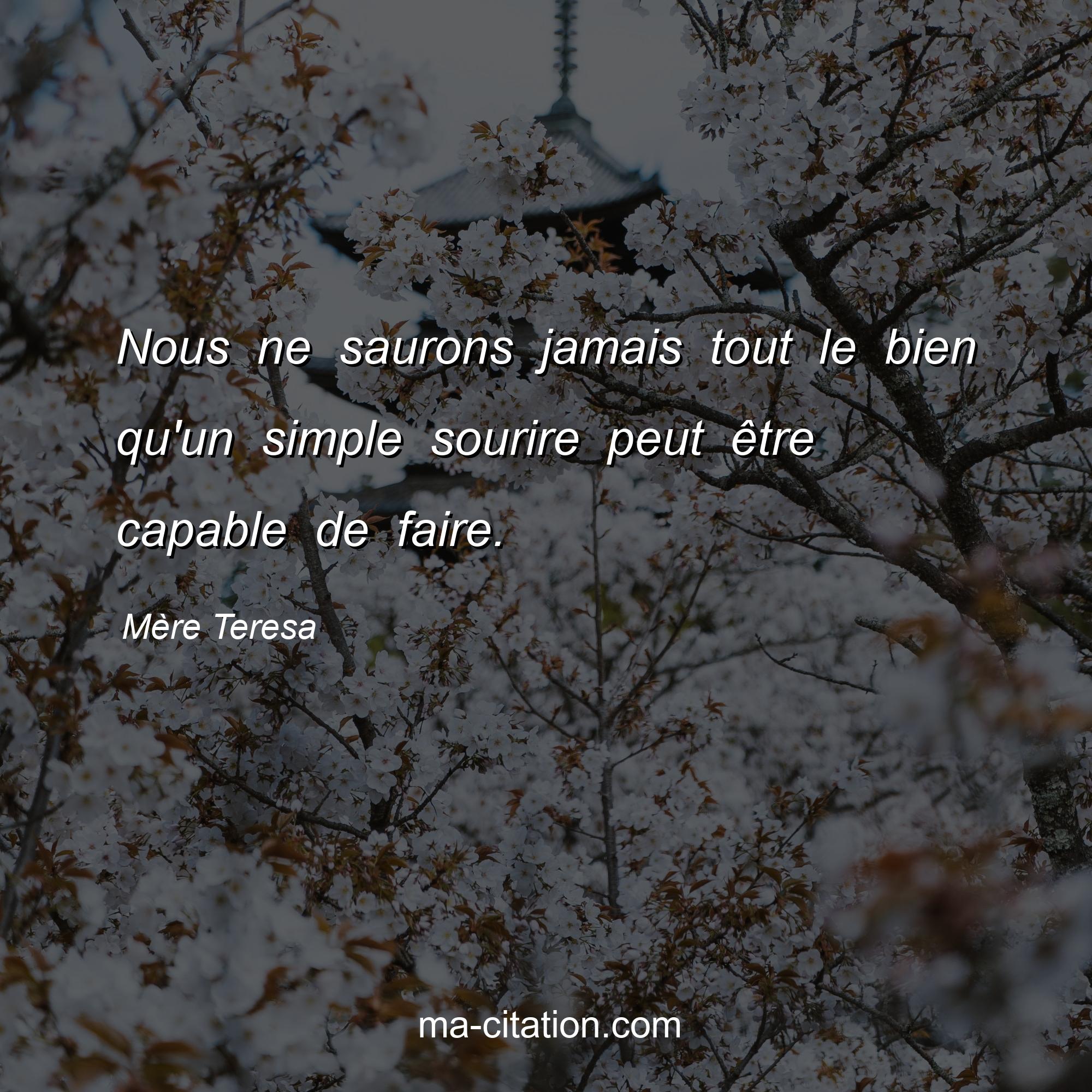 Citation sur la vie de Mère Teresa :Nous ne saurons jamais tout le bien qu'un simple sourire peut être capable de faire.