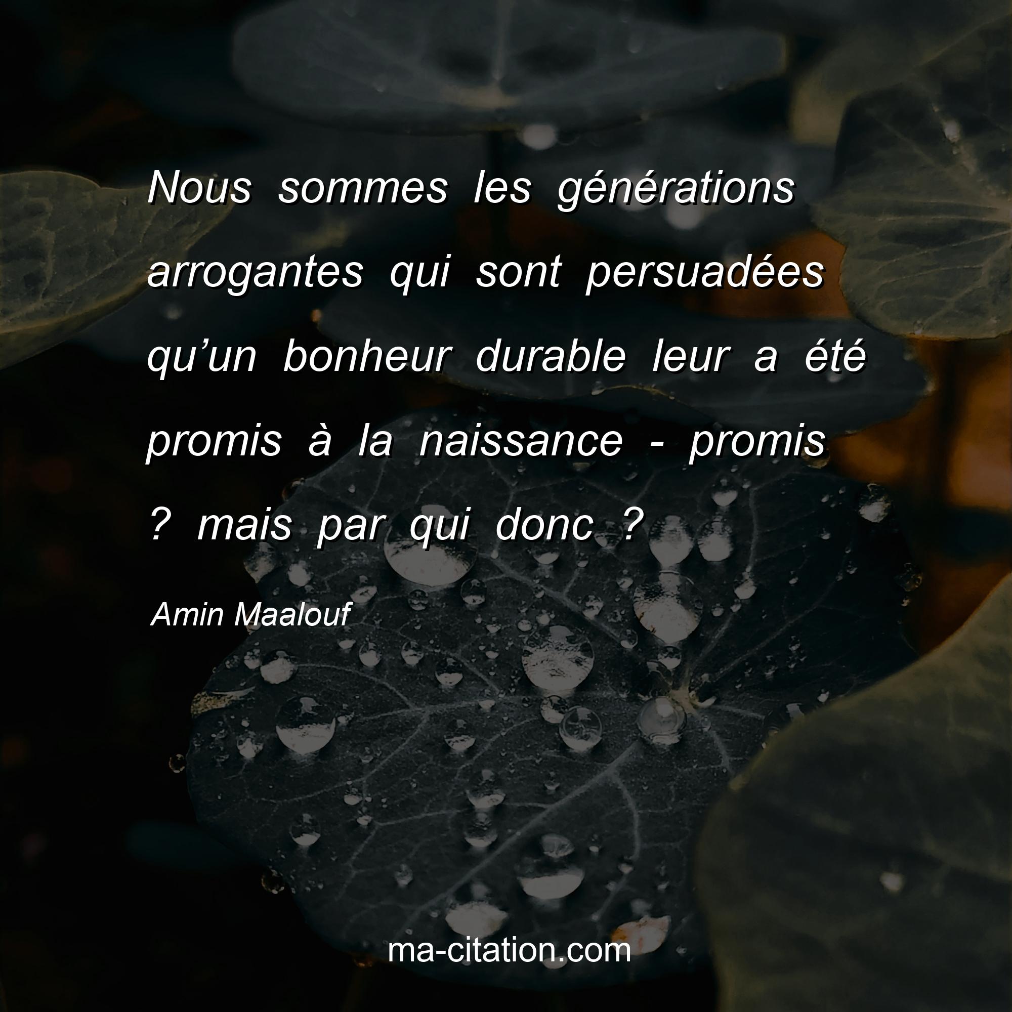 Citation sur la vie d'Amin Maalouf :Nous sommes les générations arrogantes qui sont persuadées qu’un bonheur durable leur a été promis à la naissance - promis ? mais par qui donc ?
