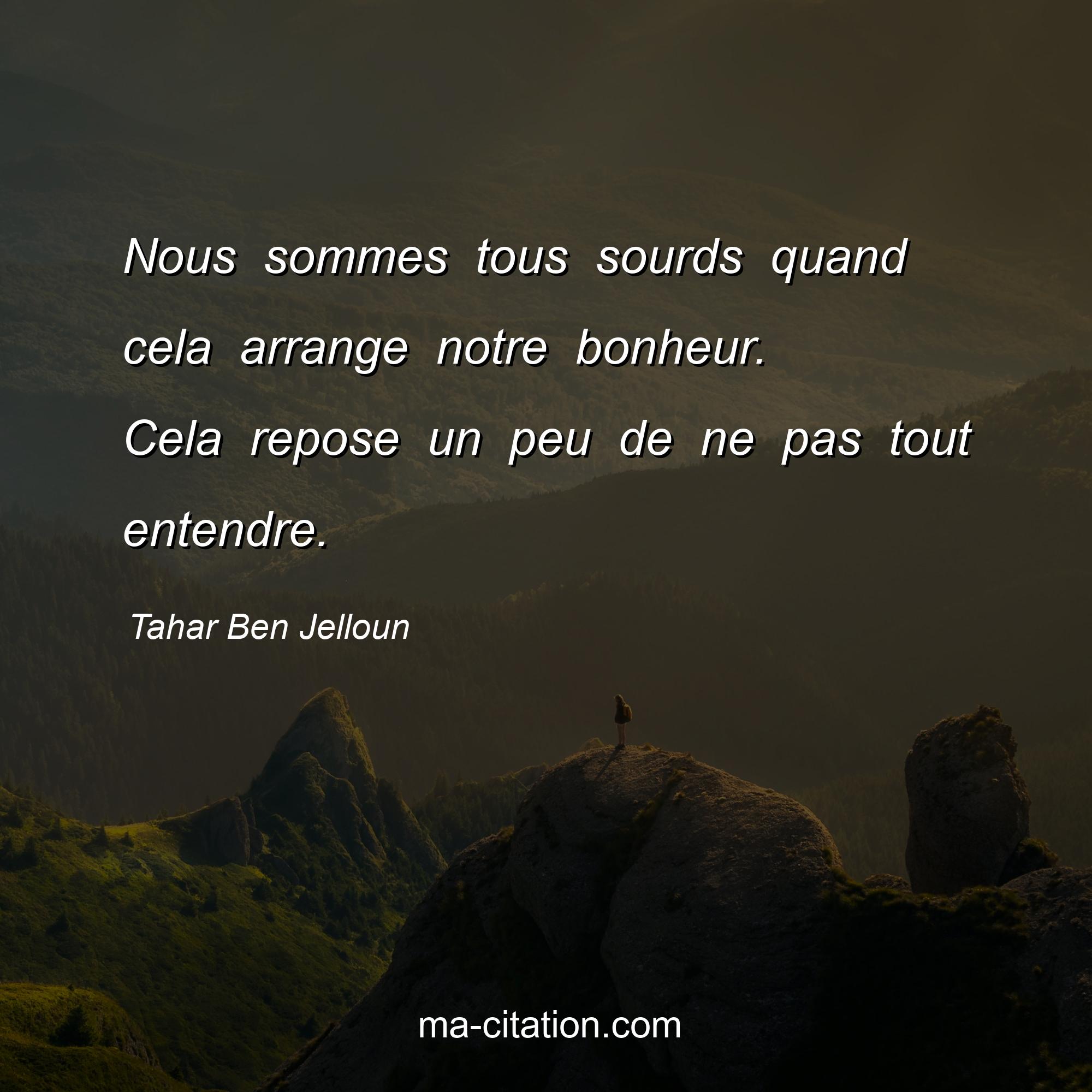 Citation sur la vie de Tahar Ben Jelloun :Nous sommes tous sourds quand cela arrange notre bonheur. Cela repose un peu de ne pas tout entendre.