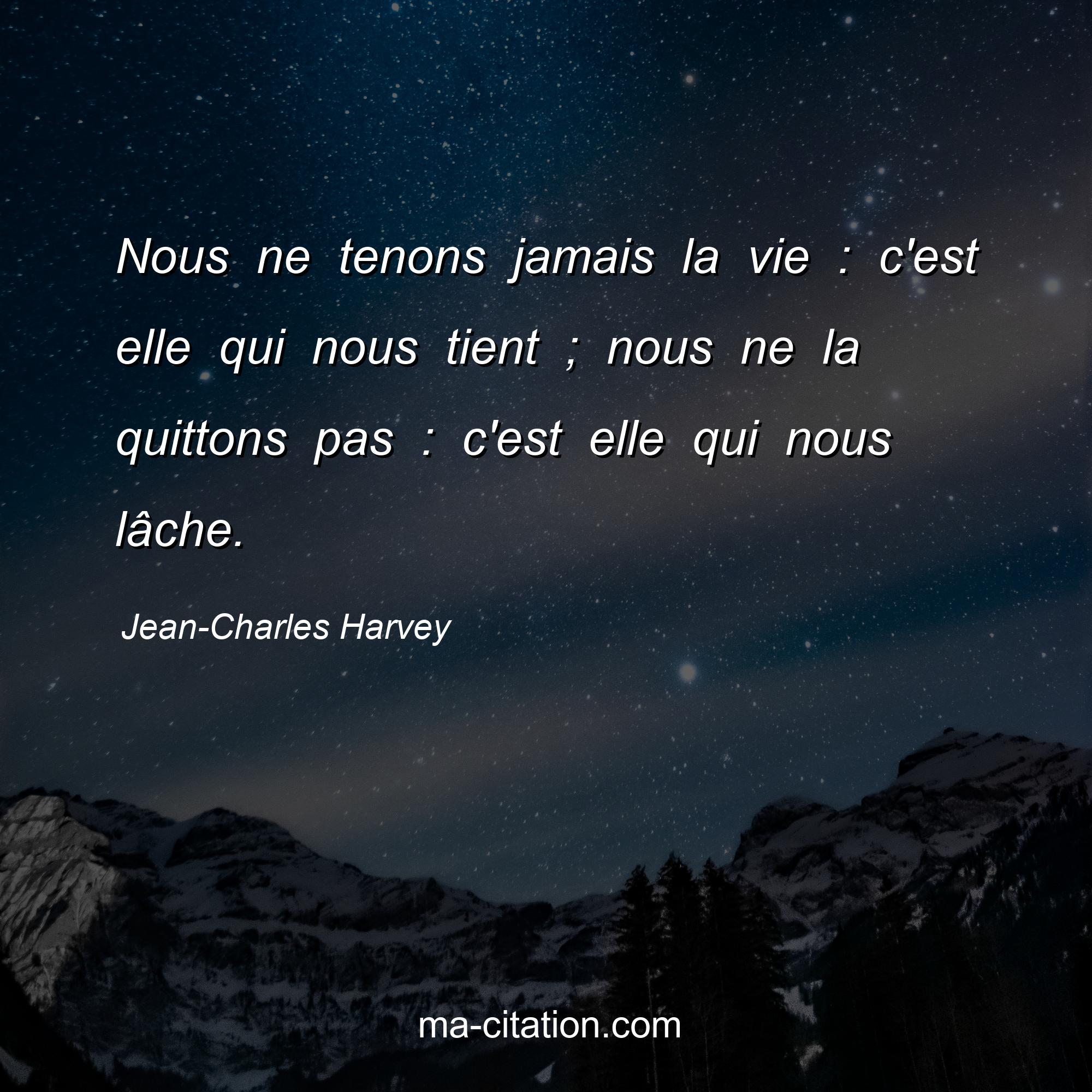Jean-Charles Harvey est l'auteur de la citation sur la vie "Nous ne tenons jamais la vie : c'est elle qui nous tient ; nous ne la quittons pas : c'est elle qui nous lâche.".