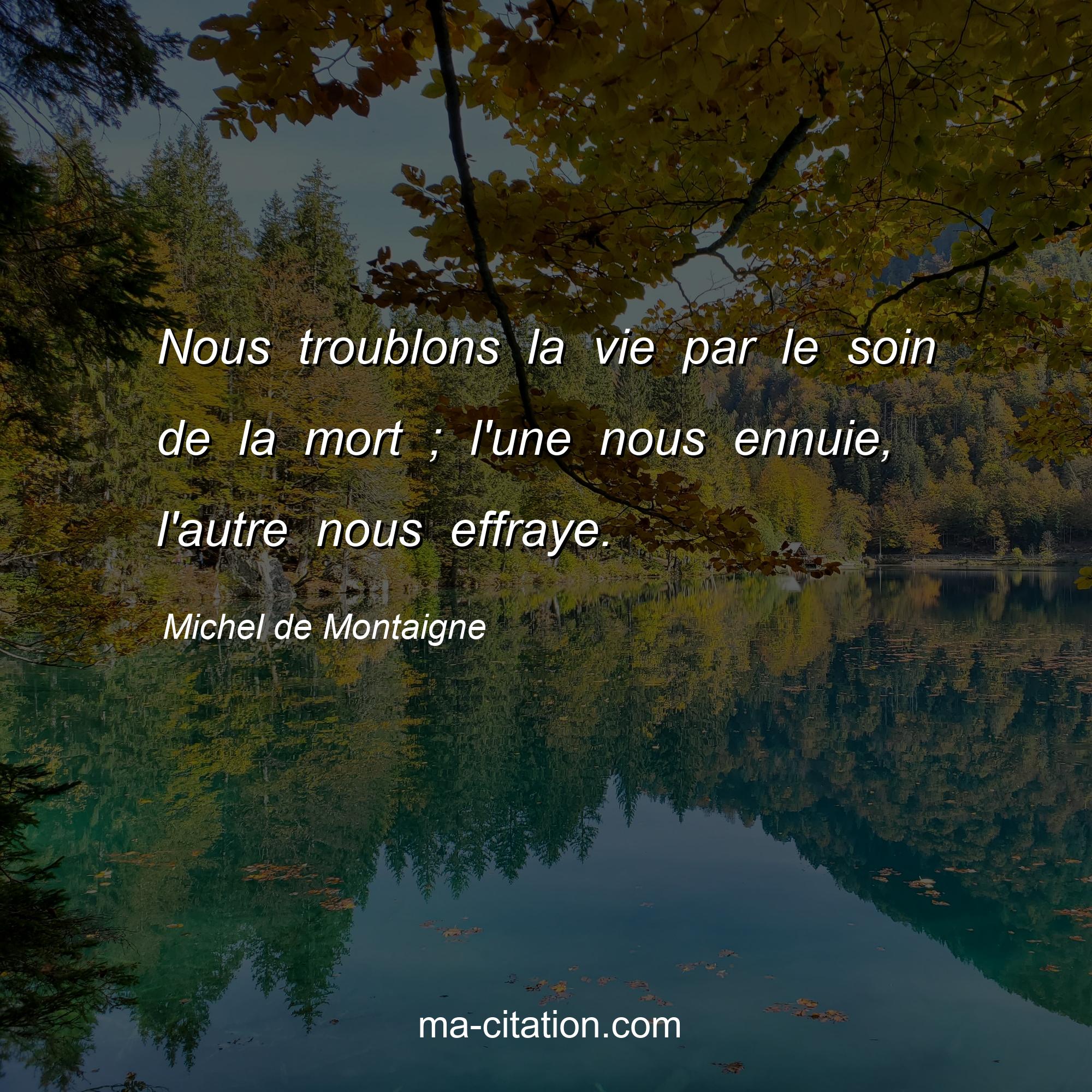 Citation sur la vie de Michel de Montaigne :Nous troublons la vie par le soin de la mort ; l'une nous ennuie, l'autre nous effraye.