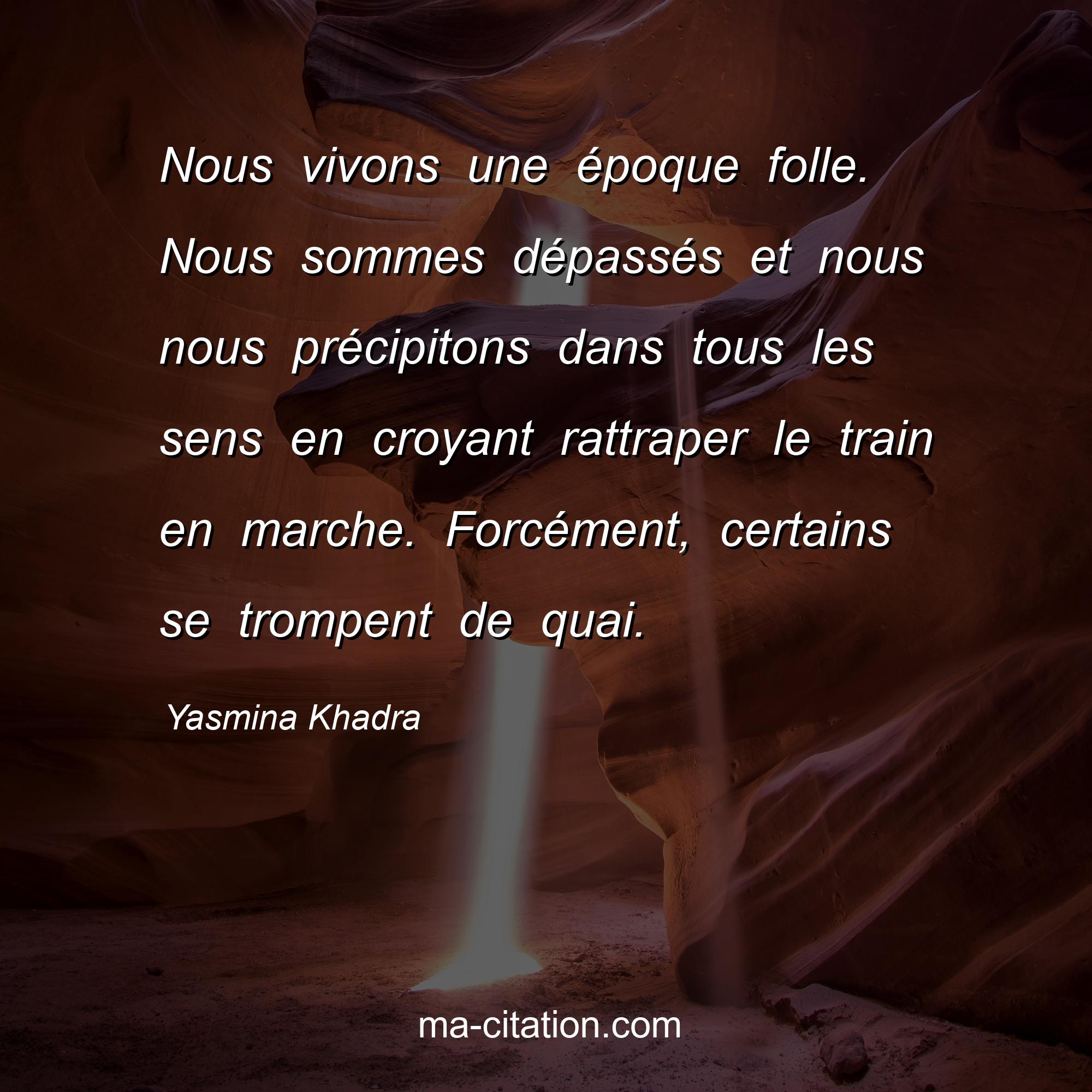 Citation sur la vie de Yasmina Khadra :Nous vivons une époque folle. Nous sommes dépassés et nous nous précipitons dans tous les sens en croyant rattraper le train en marche. Forcément, certains se trompent de quai.