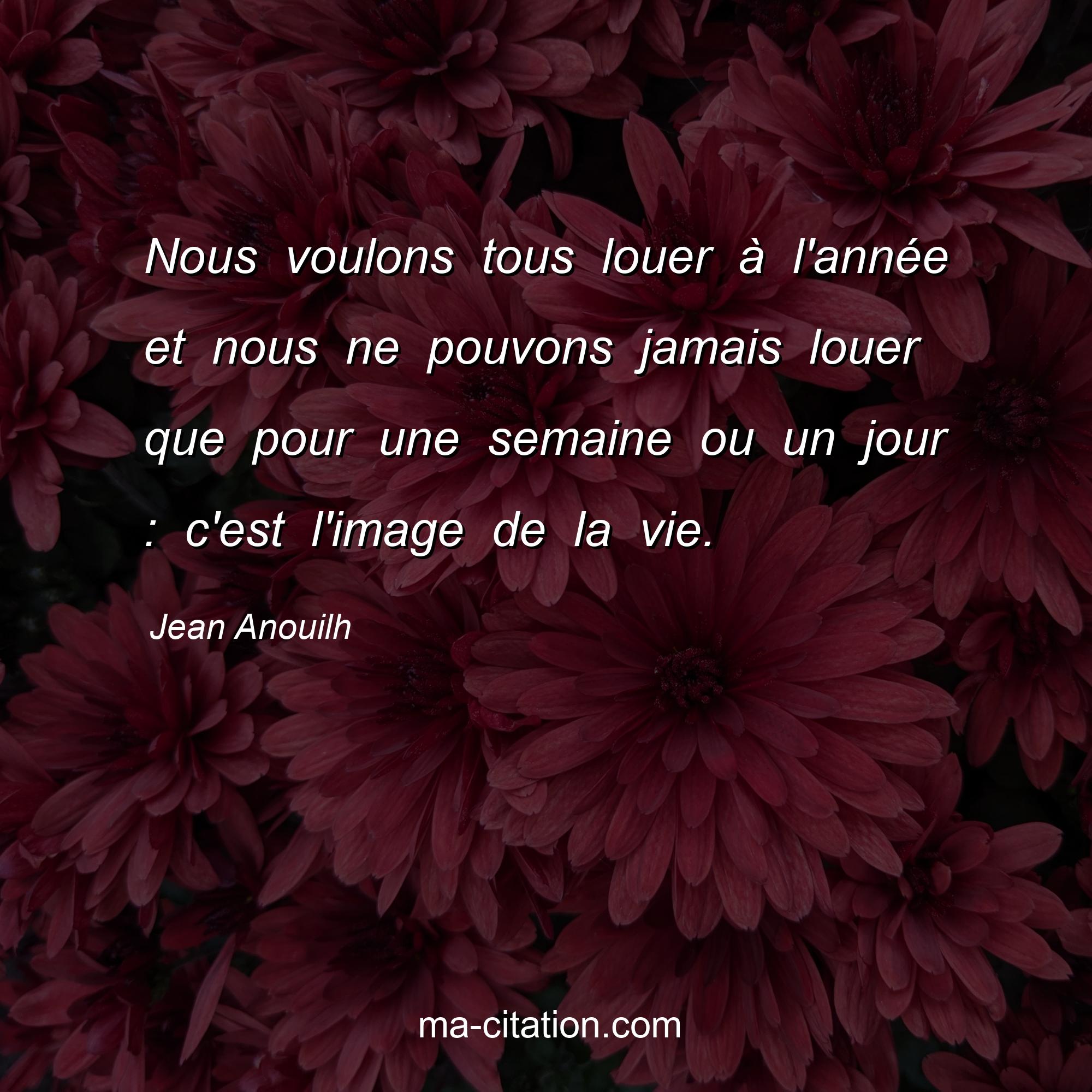 Citation sur la vie de Jean Anouilh :Nous voulons tous louer à l'année et nous ne pouvons jamais louer que pour une semaine ou un jour : c'est l'image de la vie.