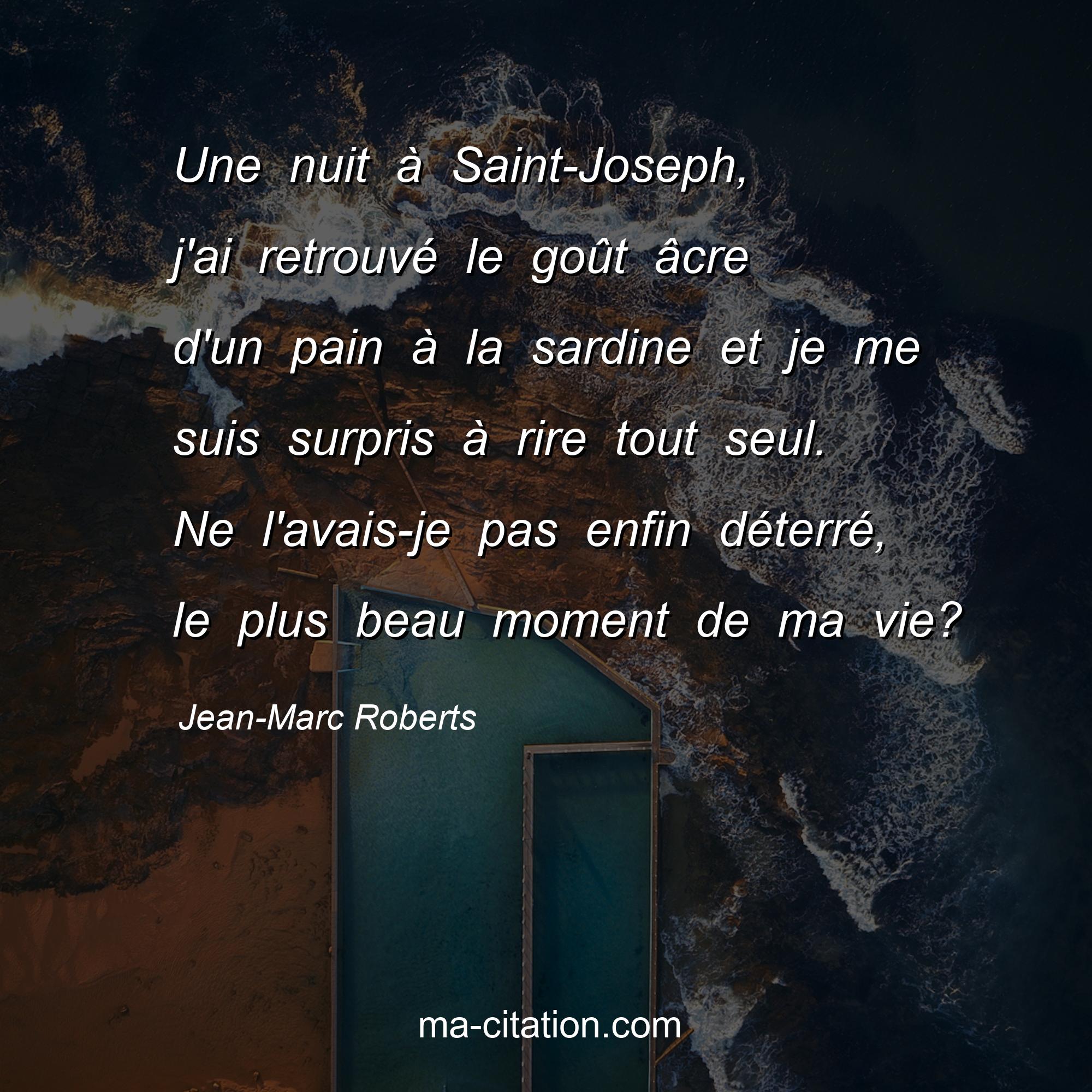 Citation sur la vie de Jean-Marc Roberts :Une nuit à Saint-Joseph, j'ai retrouvé le goût âcre d'un pain à la sardine et je me suis surpris à rire tout seul. Ne l'avais-je pas enfin déterré, le plus beau moment de ma vie?