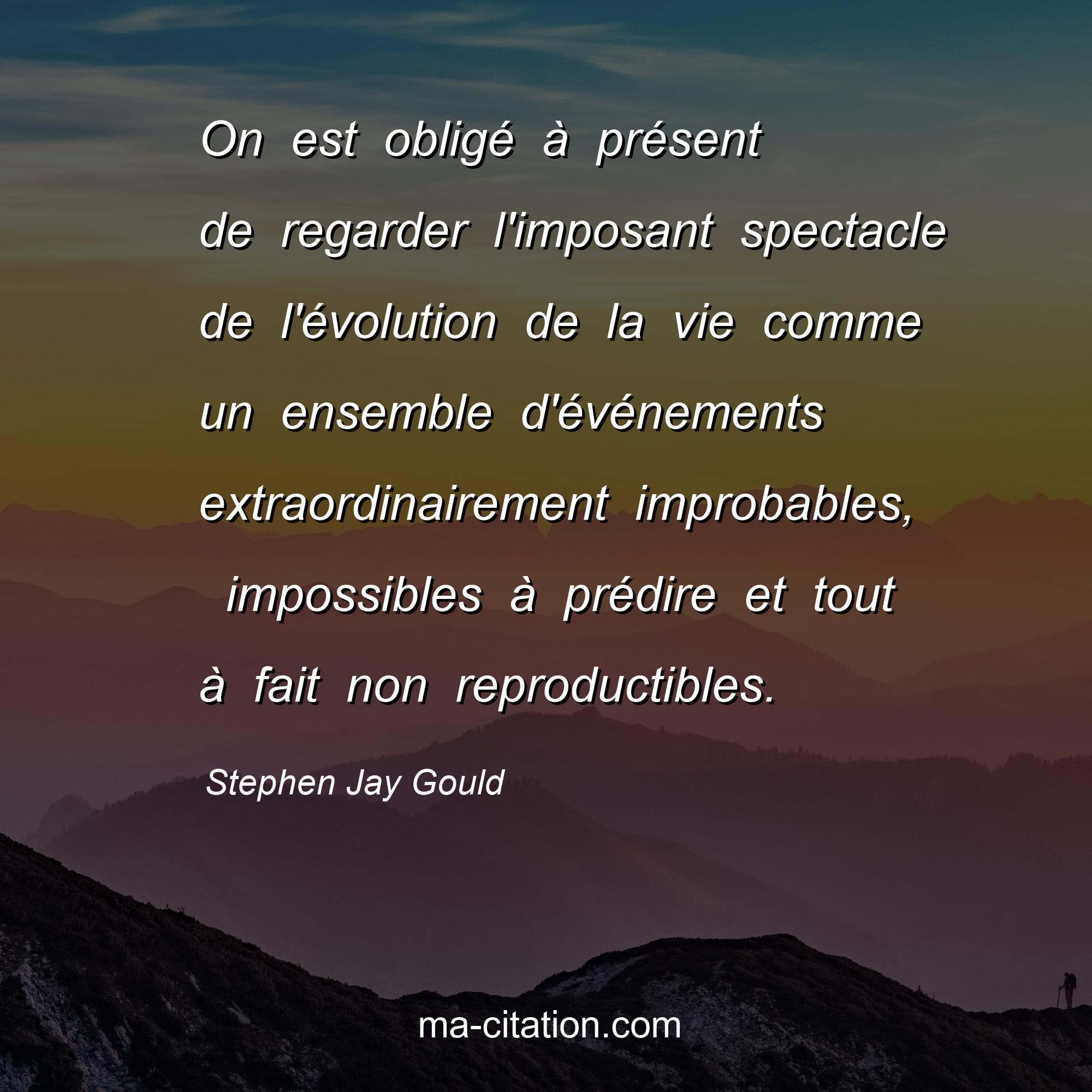 Citation sur la vie de Stephen Jay Gould :On est obligé à présent de regarder l'imposant spectacle de l'évolution de la vie comme un ensemble d'événements extraordinairement improbables, impossibles à prédire et tout à fait non reproductibles.