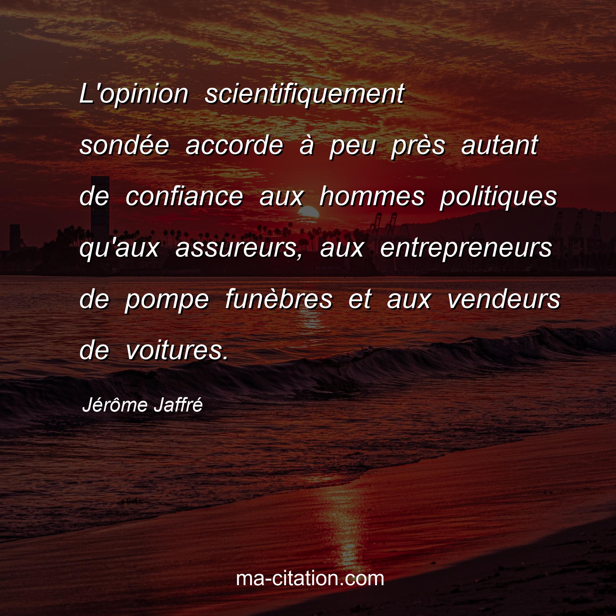 Citation sur la vie de Jérôme Jaffré :L'opinion scientifiquement sondée accorde à peu près autant de confiance aux hommes politiques qu'aux assureurs, aux entrepreneurs de pompe funèbres et aux vendeurs de voitures.