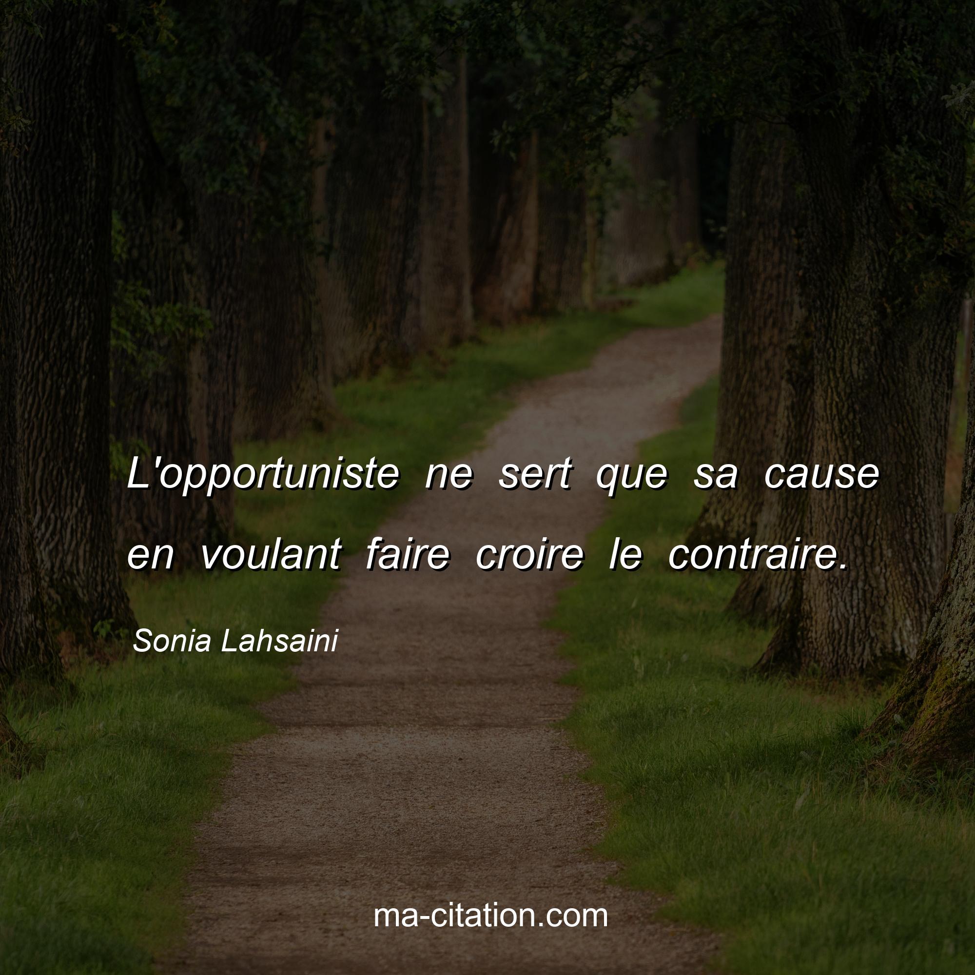 Sonia Lahsaini est l'auteur de la citation sur la vie "L'opportuniste ne sert que sa cause en voulant faire croire le contraire.".