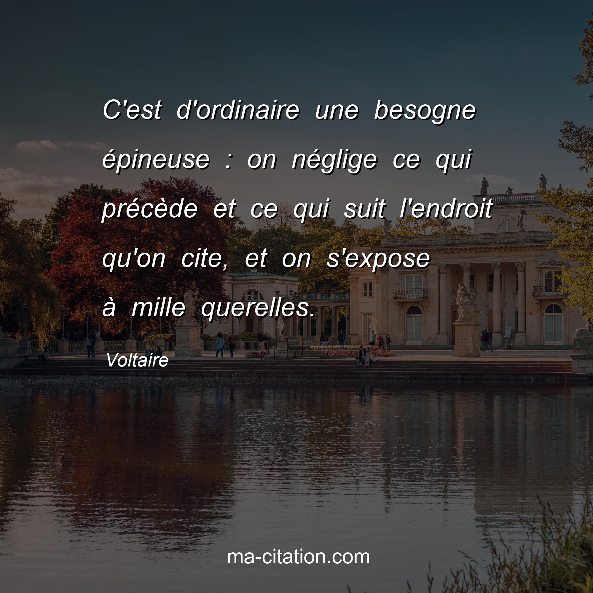 Citation sur la vie de Voltaire :C'est d'ordinaire une besogne épineuse : on néglige ce qui précède et ce qui suit l'endroit qu'on cite, et on s'expose à mille querelles.