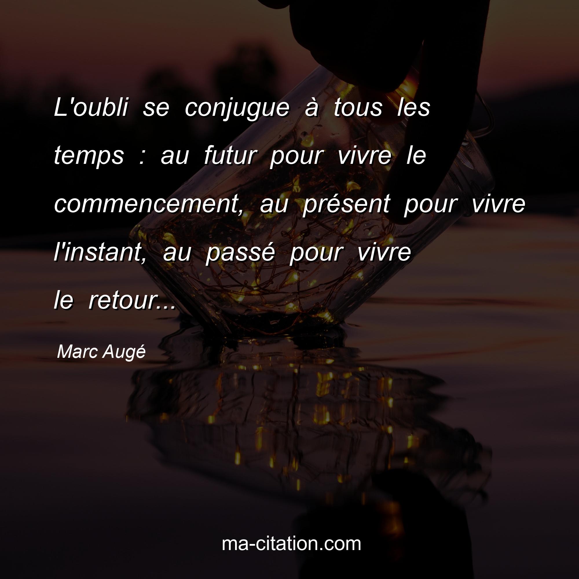 Marc Augé est l'auteur de la citation sur la vie "L'oubli se conjugue à tous les temps : au futur pour vivre le commencement, au présent pour vivre l'instant, au passé pour vivre le retour...".