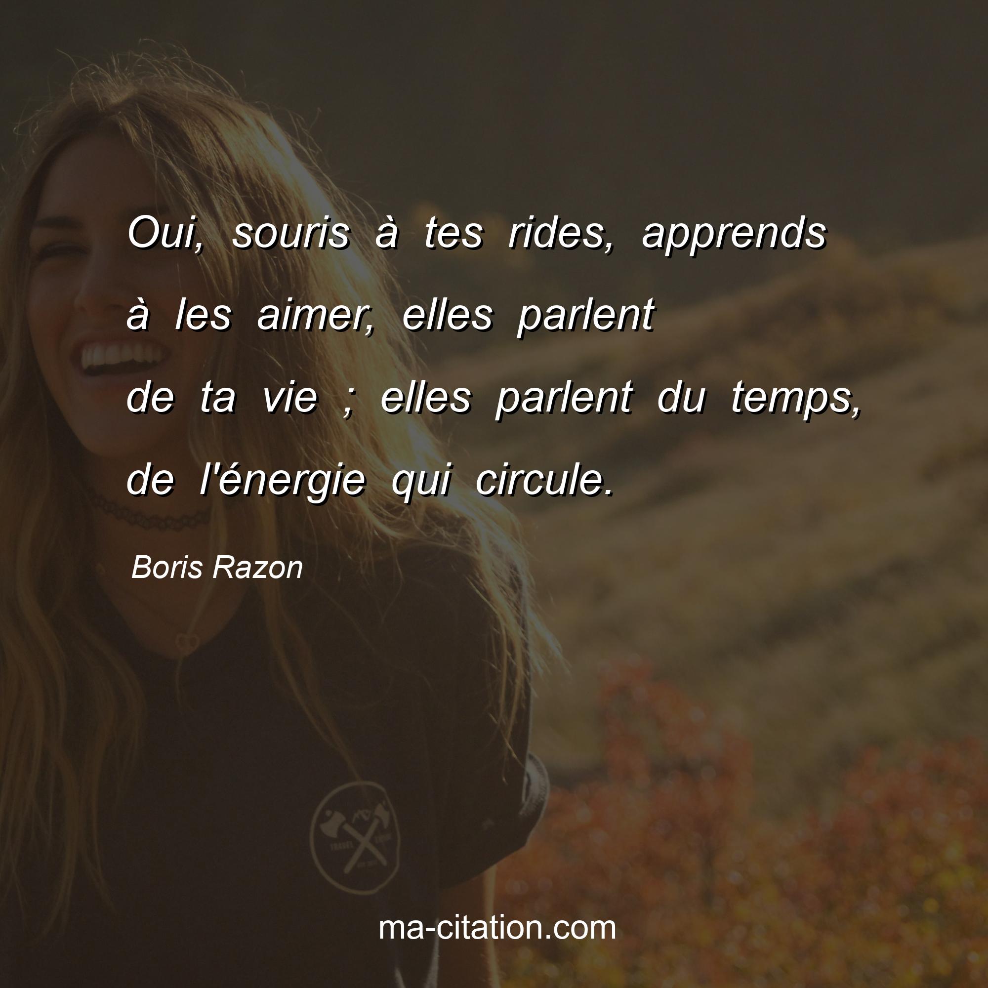 Citation sur la vie de Boris Razon :Oui, souris à tes rides, apprends à les aimer, elles parlent de ta vie ; elles parlent du temps, de l'énergie qui circule.