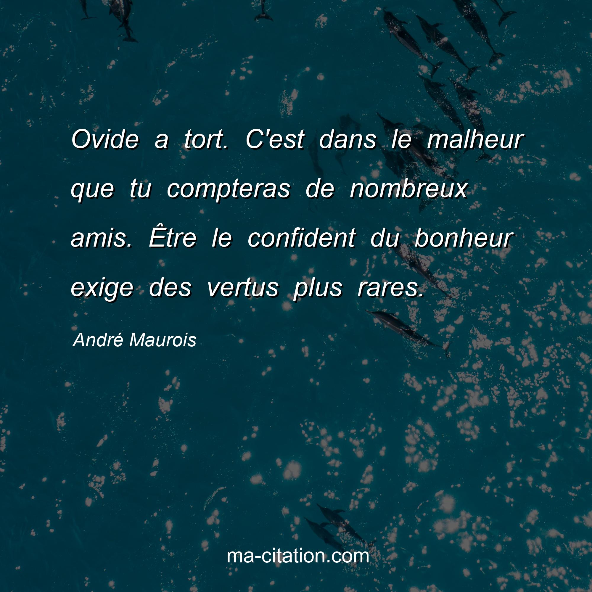 Citation sur la vie d'André Maurois :Ovide a tort. C'est dans le malheur que tu compteras de nombreux amis. Être le confident du bonheur exige des vertus plus rares.