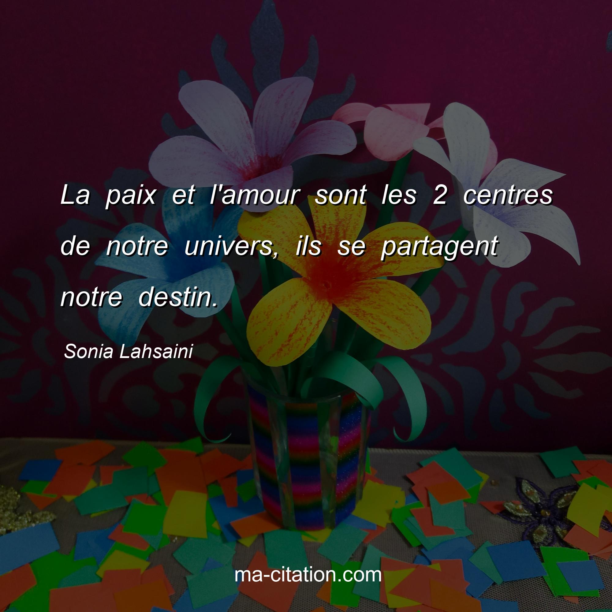 Citation sur la vie de Sonia Lahsaini :La paix et l'amour sont les 2 centres de notre univers, ils se partagent notre destin.