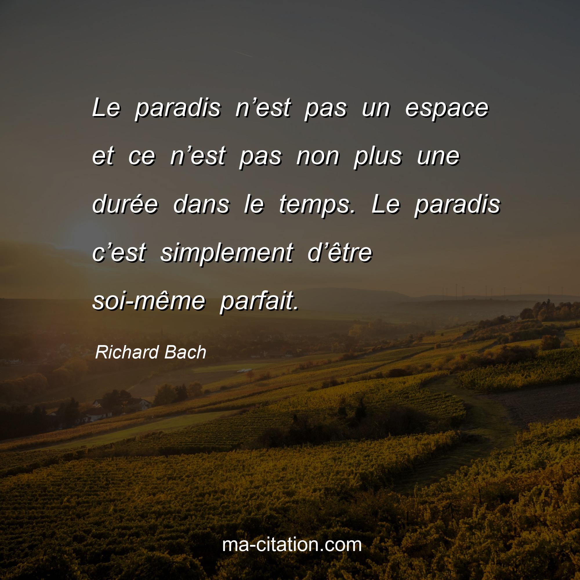 Citation sur la vie de Richard Bach :Le paradis n’est pas un espace et ce n’est pas non plus une durée dans le temps. Le paradis c’est simplement d’être soi-même parfait.