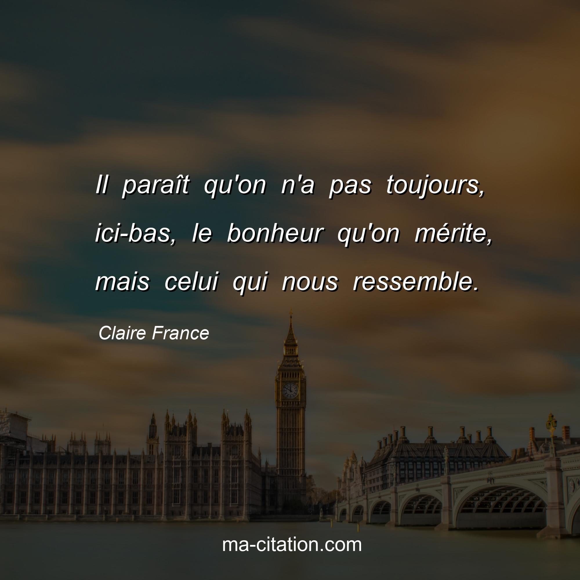 Claire France est l'auteur de la citation sur la vie "Il paraît qu'on n'a pas toujours, ici-bas, le bonheur qu'on mérite, mais celui qui nous ressemble.".