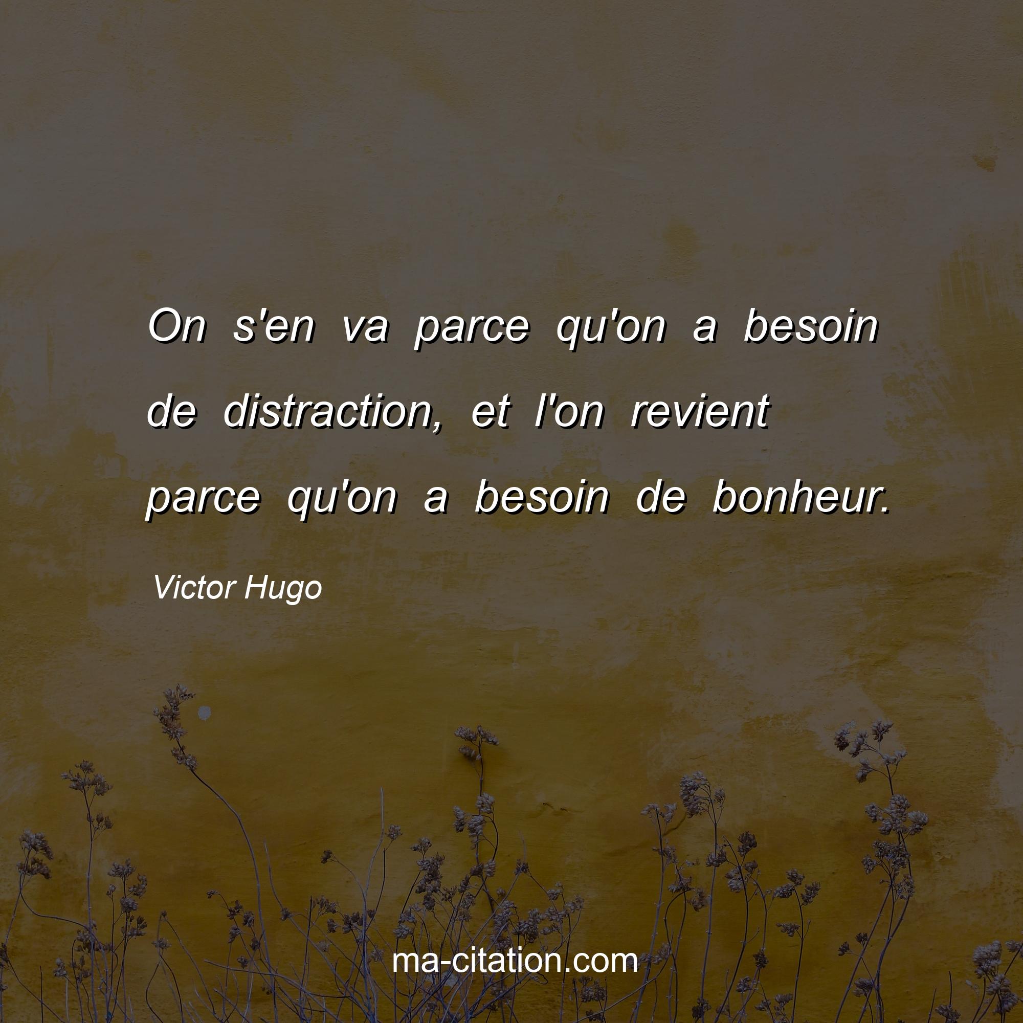 Victor Hugo est l'auteur de la citation sur la vie "On s'en va parce qu'on a besoin de distraction, et l'on revient parce qu'on a besoin de bonheur.".