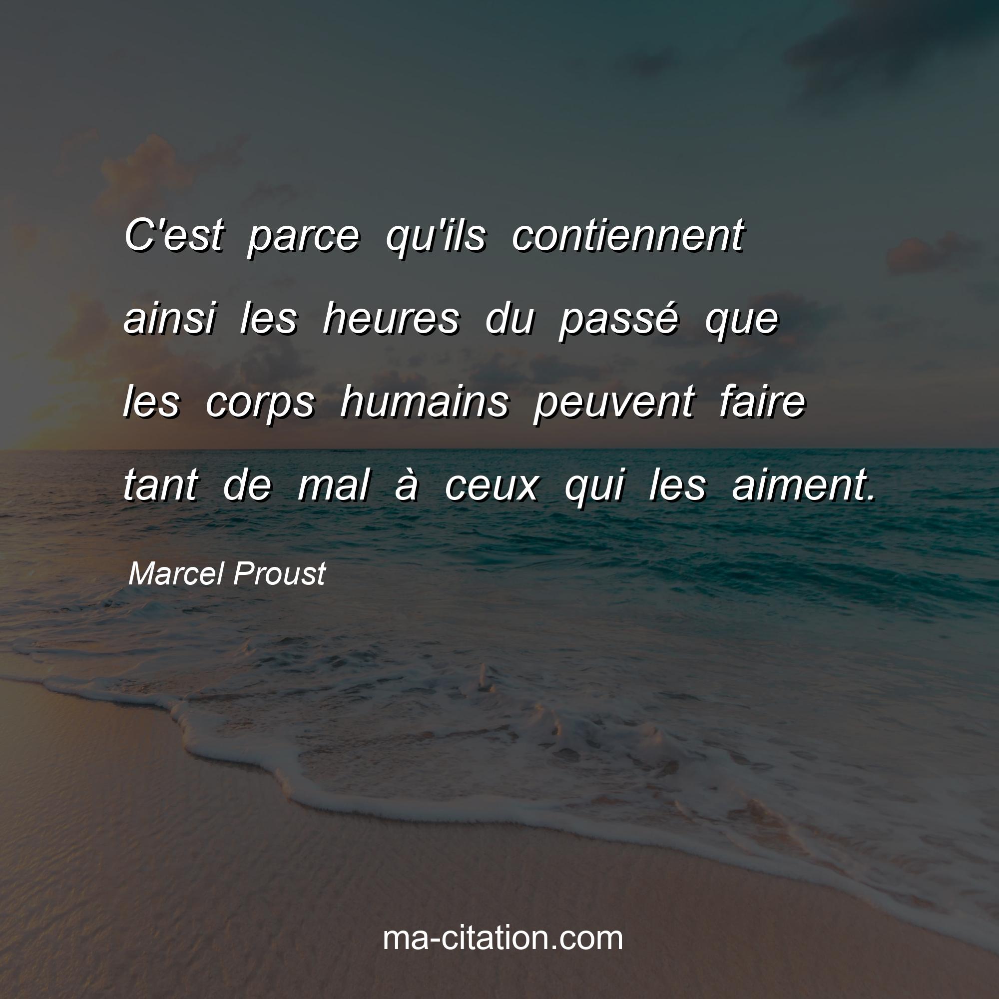 Citation sur la vie de Marcel Proust :C'est parce qu'ils contiennent ainsi les heures du passé que les corps humains peuvent faire tant de mal à ceux qui les aiment.