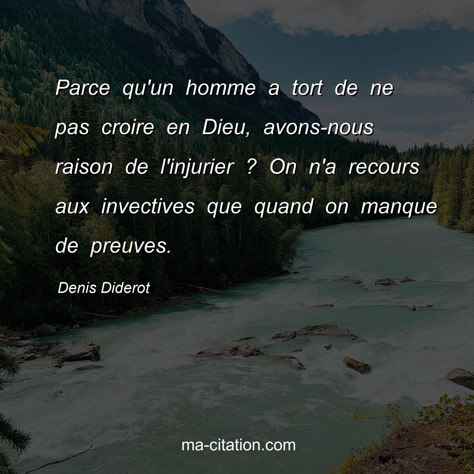 Citation sur la vie de Denis Diderot :Parce qu'un homme a tort de ne pas croire en Dieu, avons-nous raison de l'injurier ? On n'a recours aux invectives que quand on manque de preuves.