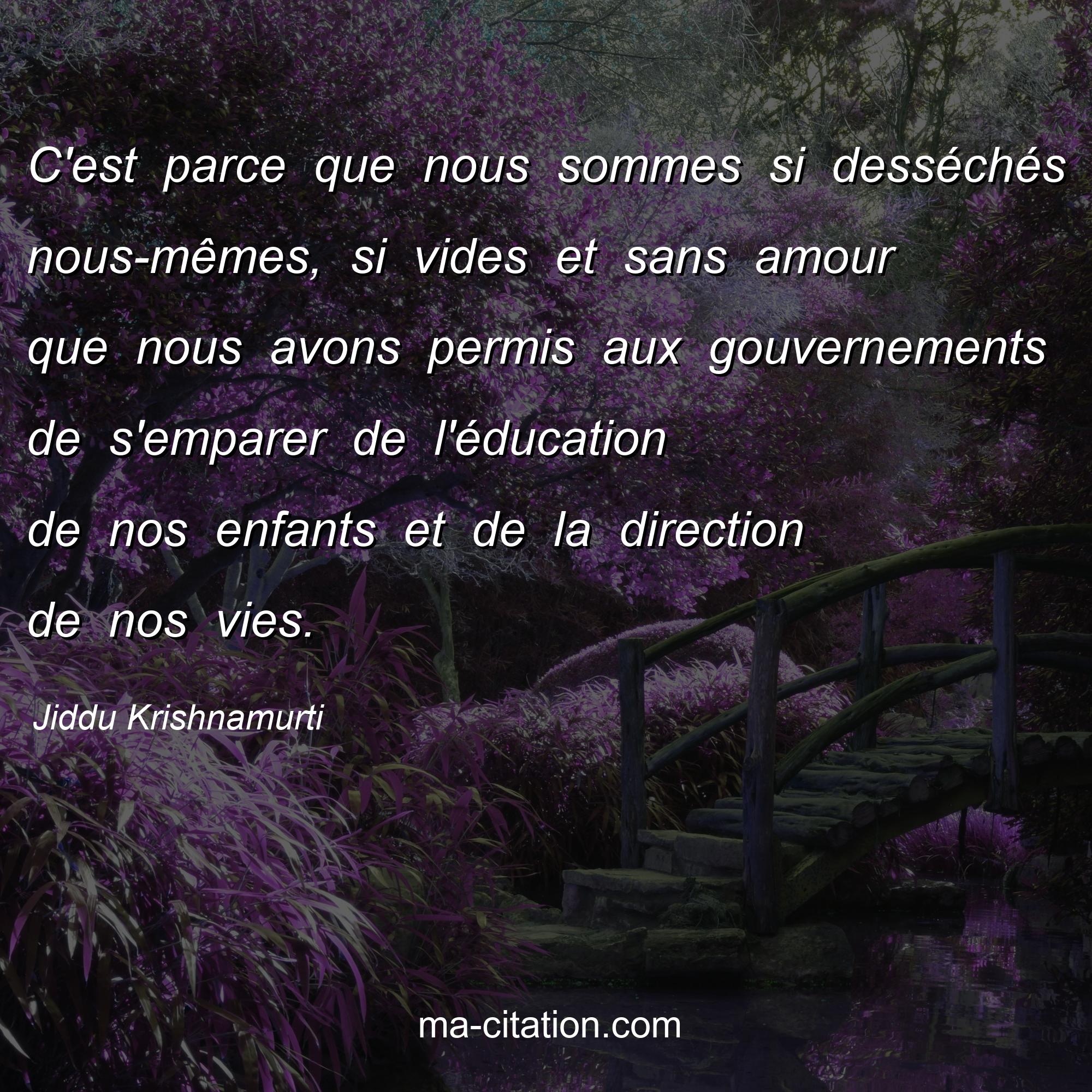 Citation sur la vie de Jiddu Krishnamurti :C'est parce que nous sommes si desséchés nous-mêmes, si vides et sans amour que nous avons permis aux gouvernements de s'emparer de l'éducation de nos enfants et de la direction de nos vies.