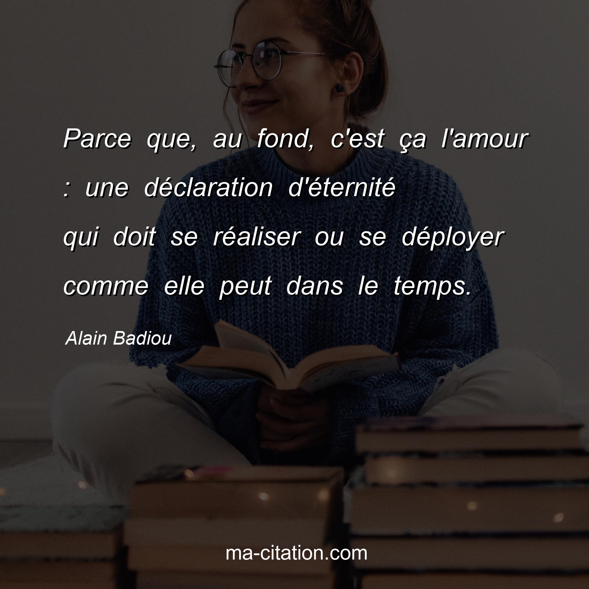 Citation sur la vie d'Alain Badiou :Parce que, au fond, c'est ça l'amour : une déclaration d'éternité qui doit se réaliser ou se déployer comme elle peut dans le temps.