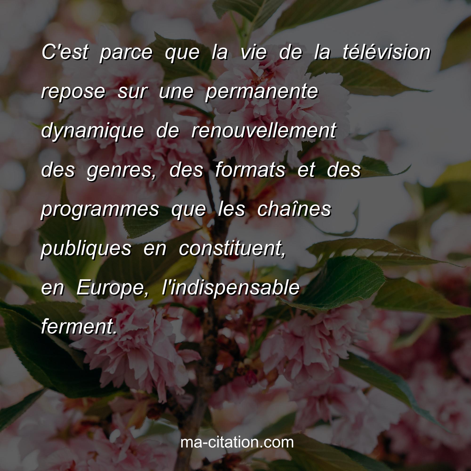 C'est parce que la vie de la télévision repose sur une permanente dynamique de renouvellement des genres, des formats et des programmes que les chaînes publiques en constituent, en Europe, l'indispensable ferment.