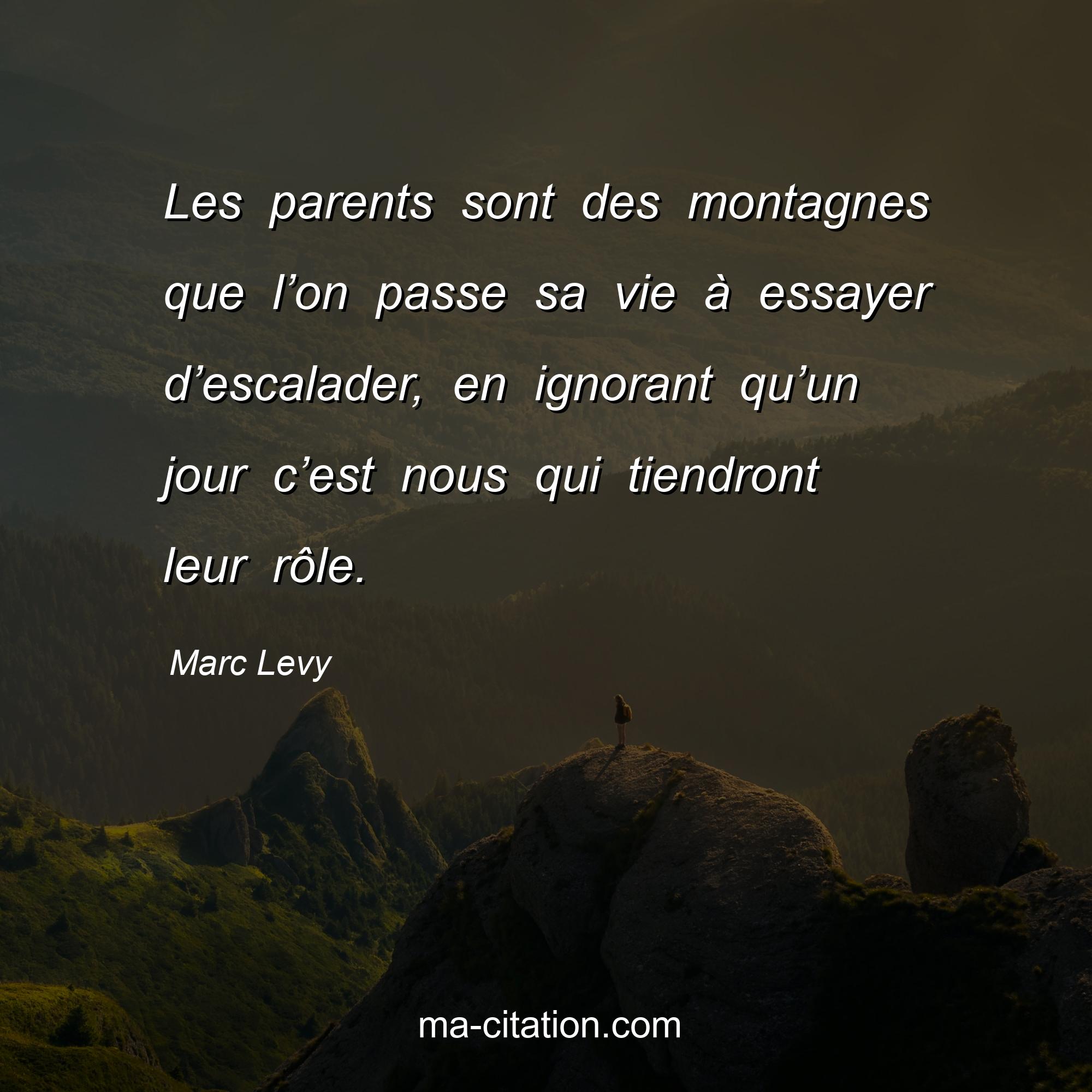 Citation sur la vie de Marc Levy :Les parents sont des montagnes que l’on passe sa vie à essayer d’escalader, en ignorant qu’un jour c’est nous qui tiendront leur rôle.
