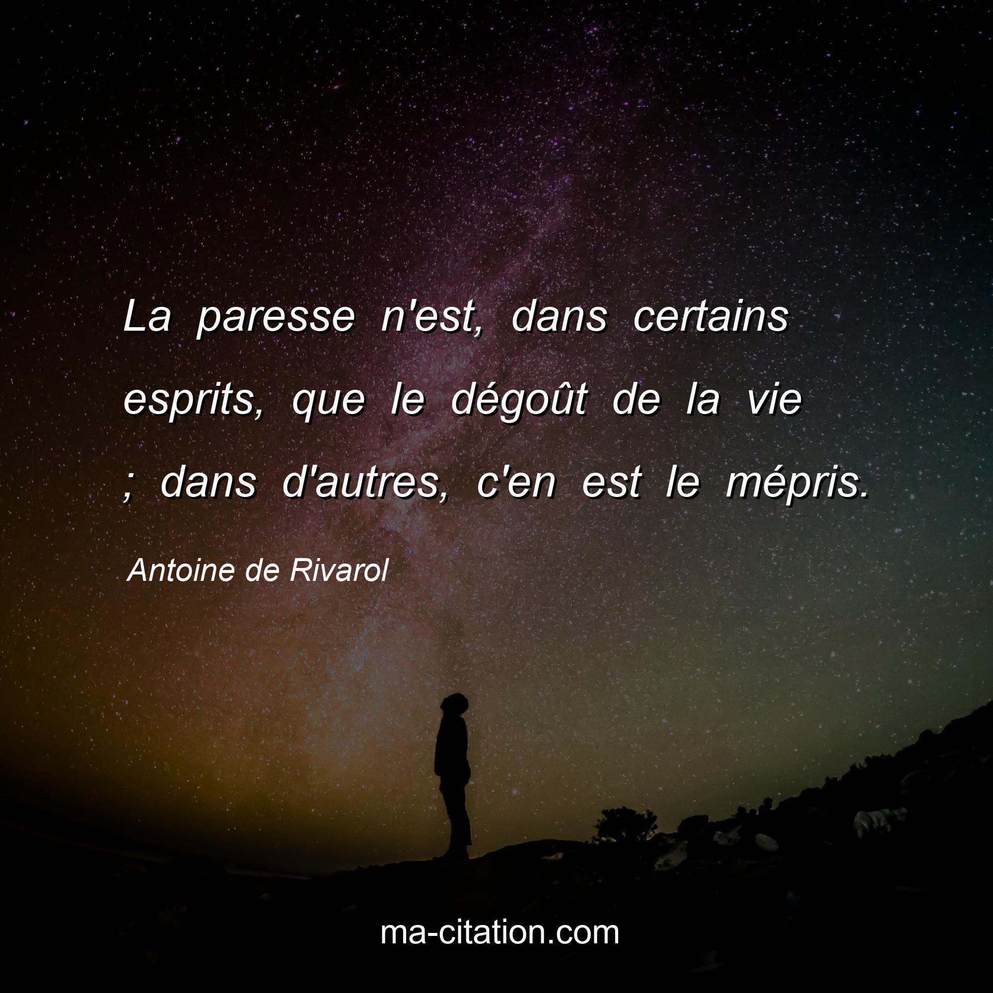 Citation sur la vie d'Antoine de Rivarol :La paresse n'est, dans certains esprits, que le dégoût de la vie ; dans d'autres, c'en est le mépris.