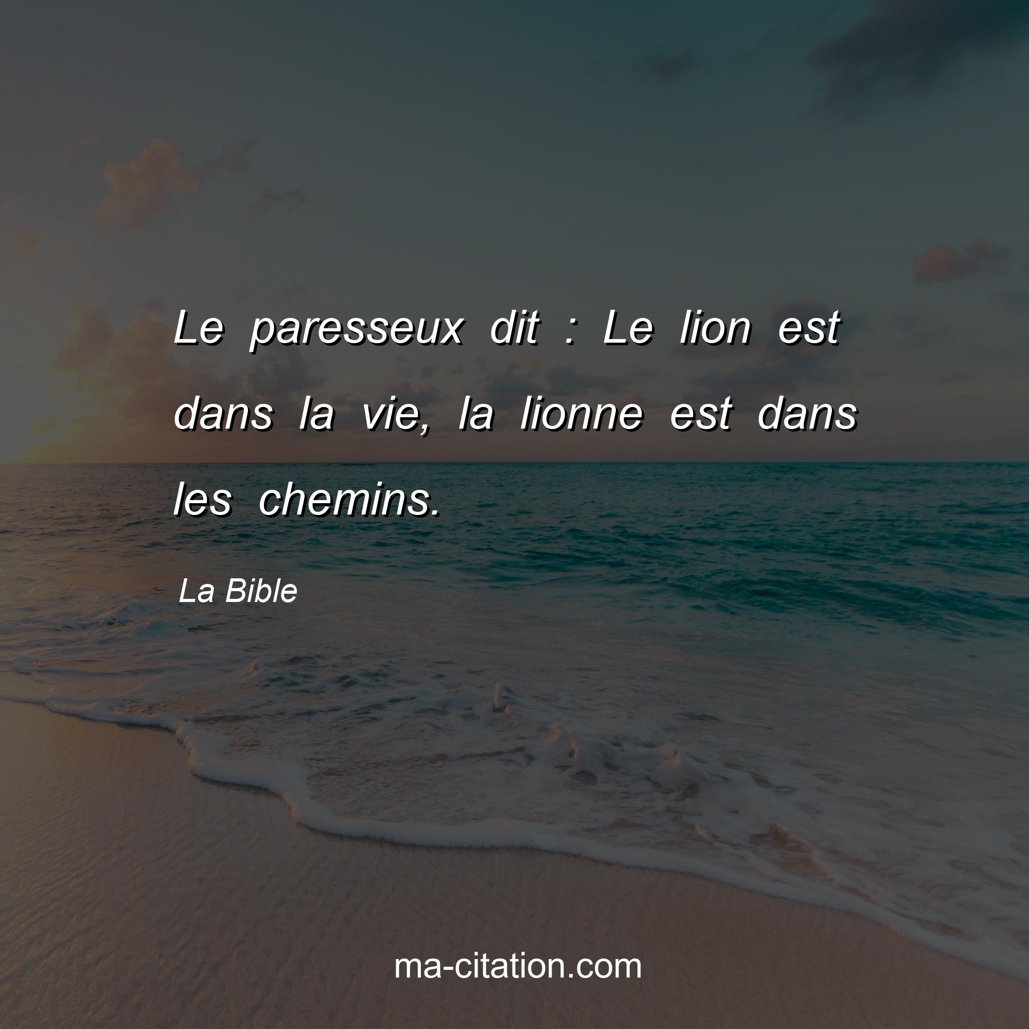 Citation sur la vie de La Bible :Le paresseux dit : Le lion est dans la vie, la lionne est dans les chemins.