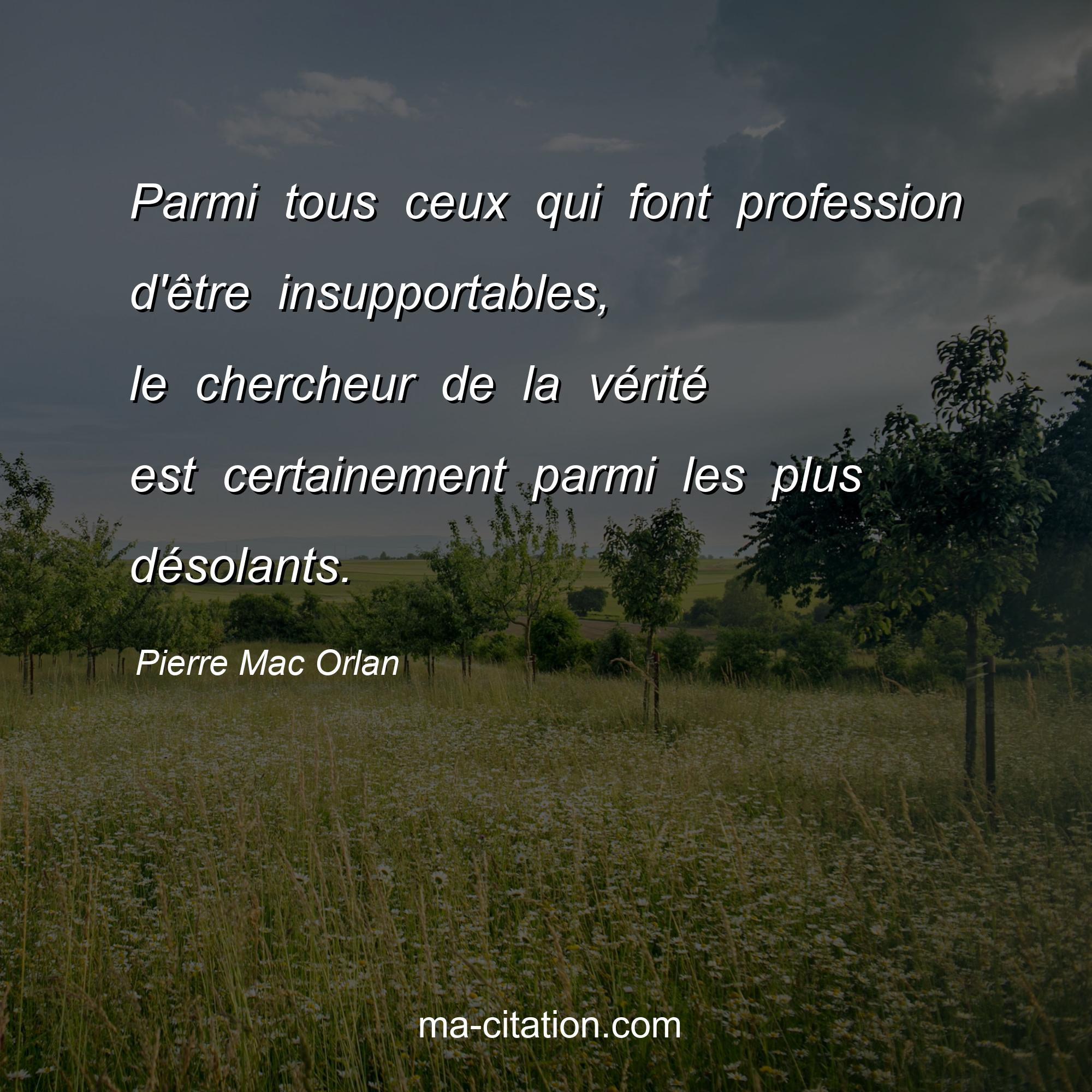 Citation sur la vie de Pierre Mac Orlan :Parmi tous ceux qui font profession d'être insupportables, le chercheur de la vérité est certainement parmi les plus désolants.
