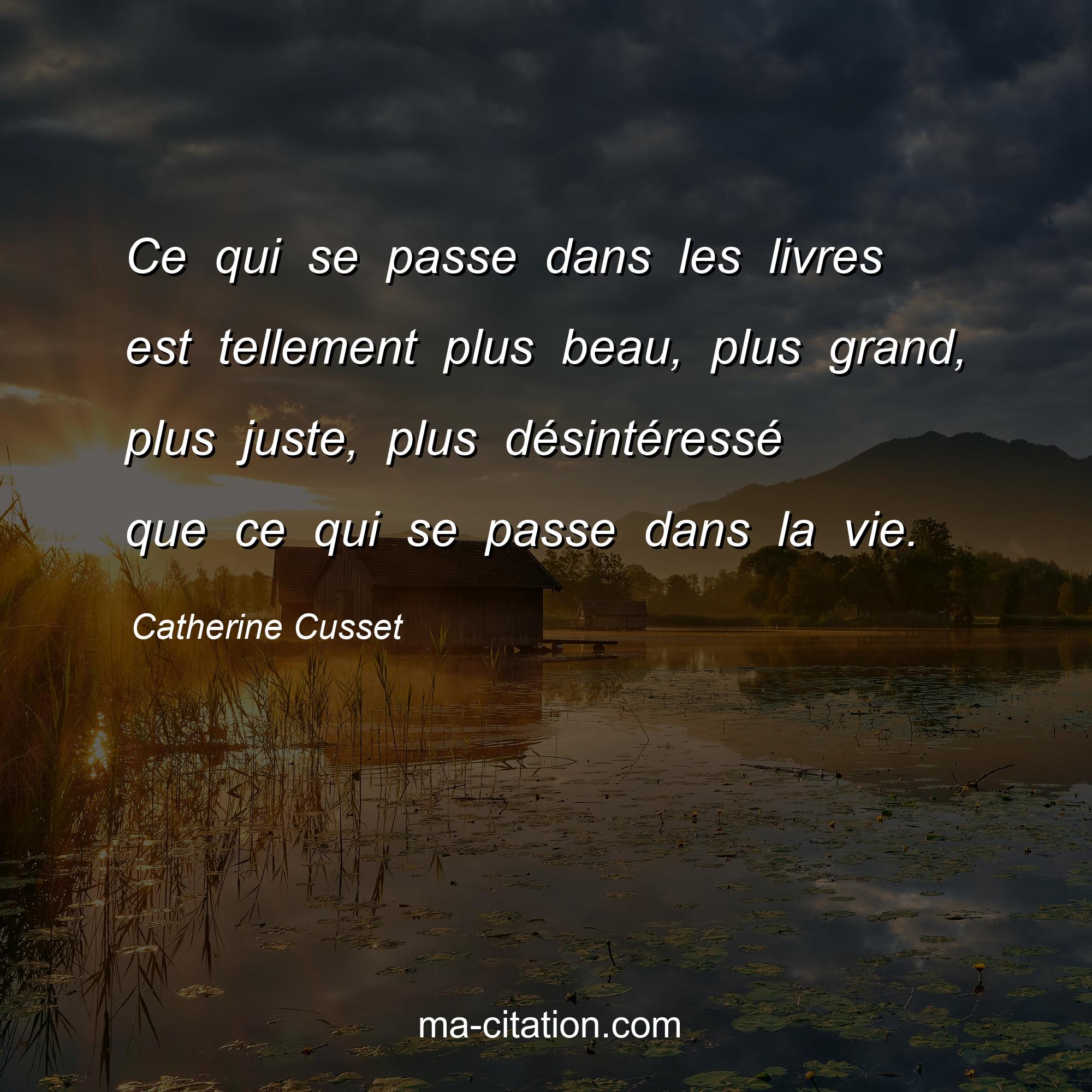 Catherine Cusset est l'auteur de la citation sur la vie "Ce qui se passe dans les livres est tellement plus beau, plus grand, plus juste, plus désintéressé que ce qui se passe dans la vie.".
