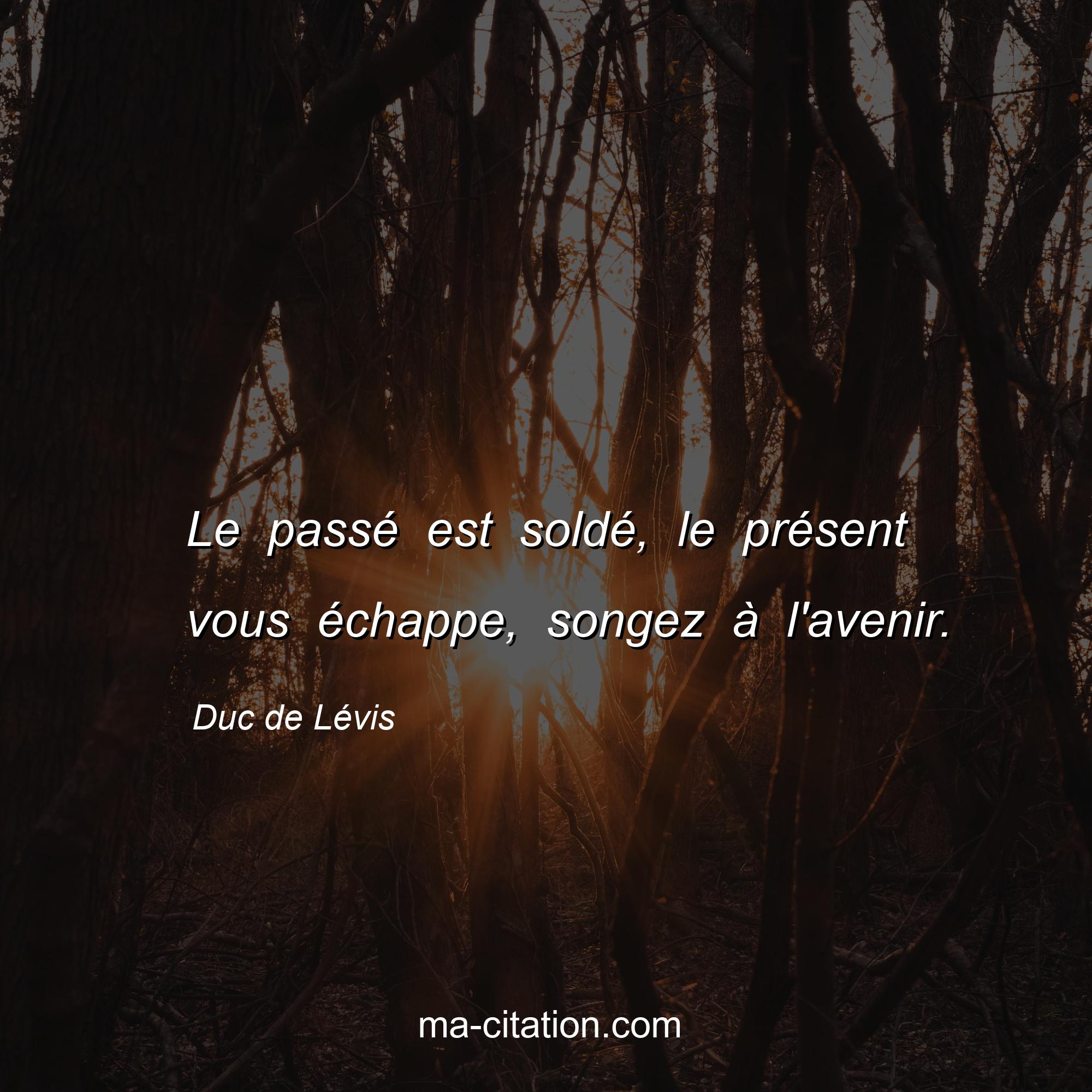 Citation sur la vie de Duc de Lévis :Le passé est soldé, le présent vous échappe, songez à l'avenir.