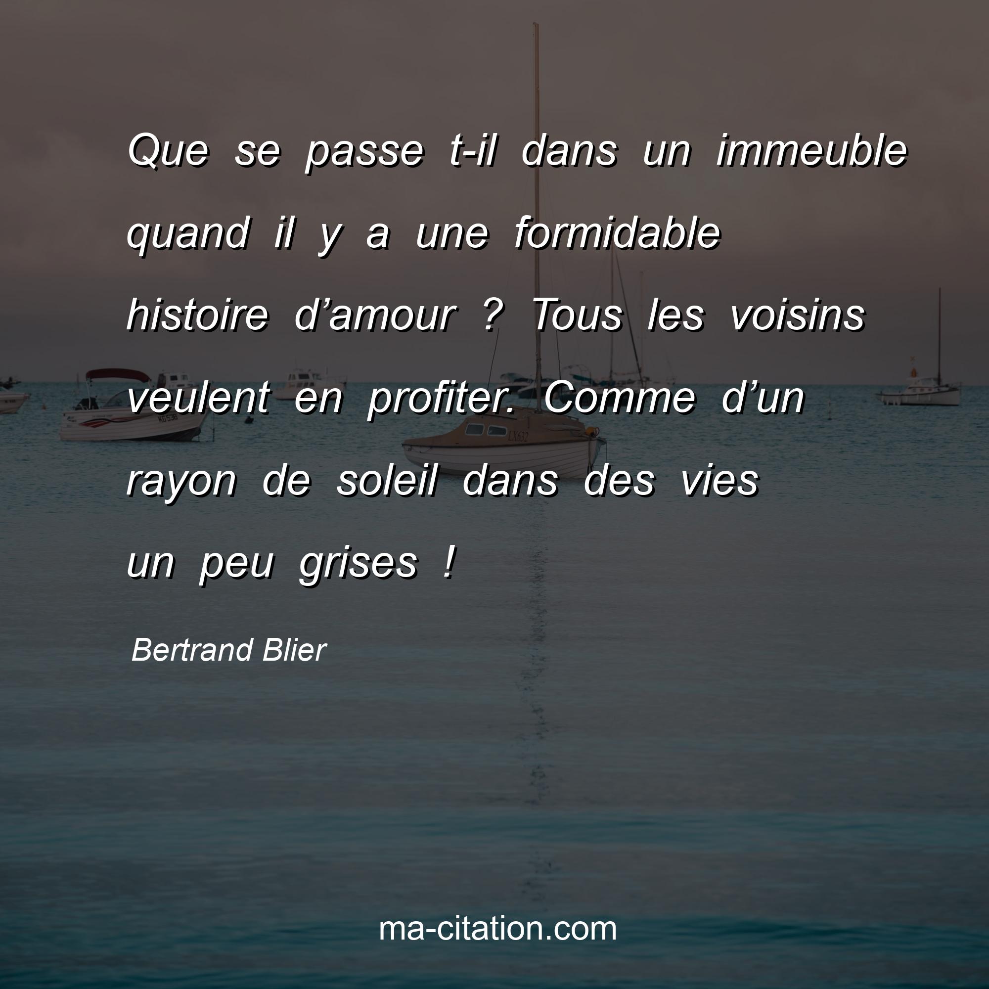 Bertrand Blier est l'auteur de la citation sur la vie "Que se passe t-il dans un immeuble quand il y a une formidable histoire d’amour ? Tous les voisins veulent en profiter. Comme d’un rayon de soleil dans des vies un peu grises !".