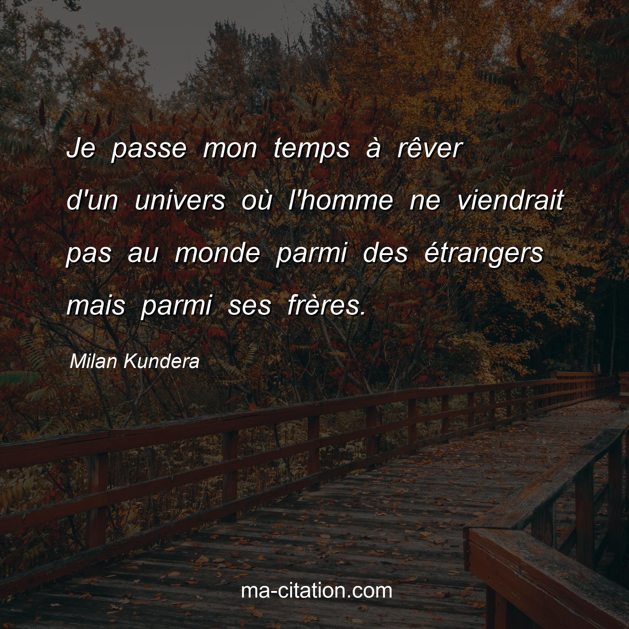 Milan Kundera est l'auteur de la citation sur la vie "Je passe mon temps à rêver d'un univers où l'homme ne viendrait pas au monde parmi des étrangers mais parmi ses frères.".