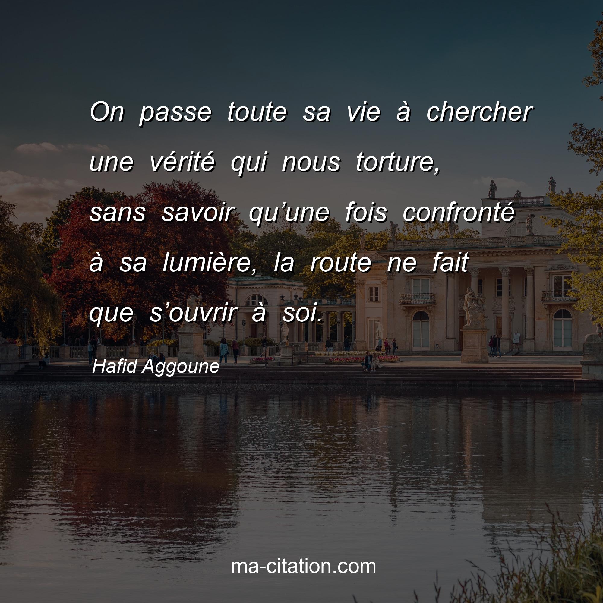 Hafid Aggoune est l'auteur de la citation sur la vie "On passe toute sa vie à chercher une vérité qui nous torture, sans savoir qu’une fois confronté à sa lumière, la route ne fait que s’ouvrir à soi.".